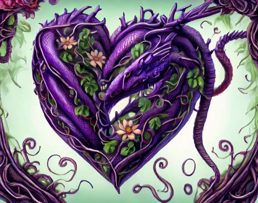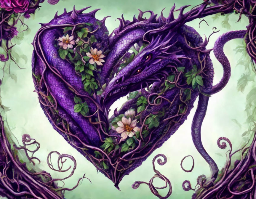 Purple Dragon with Green Eyes in Heart Shape Among Roses and Vines
