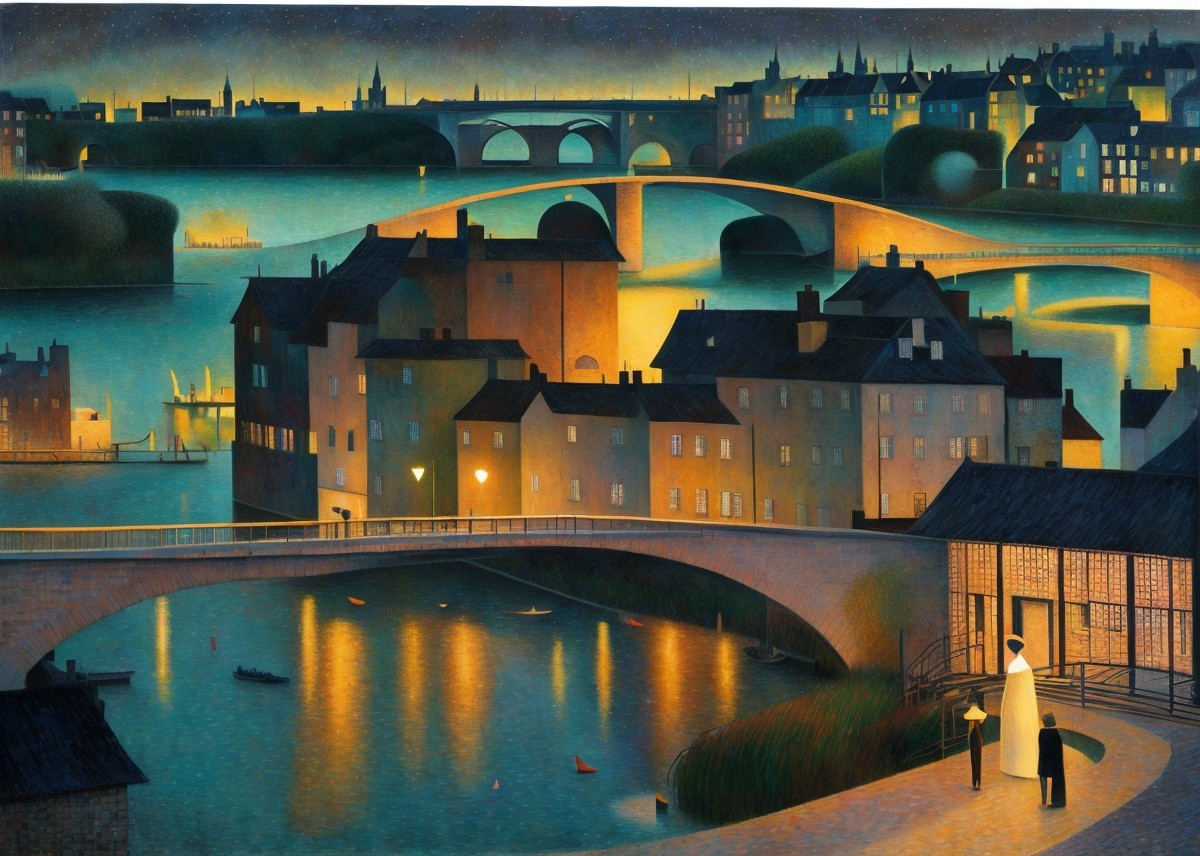 A stylized painting of a serene riverside town at dusk, with illuminated buildings, bridges, and a boat gliding on the water.