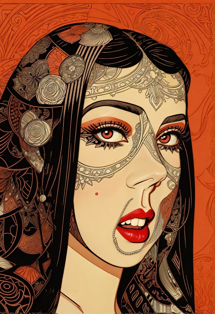 Art Nouveau portraiture, stylized Woodblock print, detailed lineage forms female head, headshot, cel-shaded, comic book art style, in the style of Margaret Keane and Elena Balbusso. Zentangle lines form detailed female head, triadic color scheme red white black, embossed with cracks, high coloring 1.9, tints of 1970s advertising art, 3d art, Synthetic essence, tints of geometrical art, subsurface scattering 1.7, back-lit, effects 1.8, streamline_moderne, anisotropic filtering 1.7, intricate details, shadow mapping 1.8, dynamic lighting 1.7, vibrant strokes, maximalism, radiance, highly detailed ornamental features, illustrative style, radiance, maximalism, plasticity 1.6, complexion,, octane render, bright, back-lit, luminous plasticity 1.6, illustrative stylization 1.6, hues, highly chipped peeling, dynamic lighting 1.7, high coloring 1.4, vector 9:7, soft edges, light hues, highly chipped background, dynamic lighting 1.7, ambient occlusion 1.5, anisotropic filtering 1.7, luminous, saturated colors 1.6, geometrical, stacked lines, bold lines, vibrant lineage, smooth lines, intricate details of lineage, raytraced shadows 1.8, sublime, mood, occult, brightness 1.9, dynamic lighting 1.7, ((vaporwave 1.7, tints of 1950s book cover art, octane render), very detailed illustration, abstract 11:4), stylized details, varnish, thick brushed textures 1.7, beautiful composition 1.9, coffinwood 1.7, american gothic 1.9