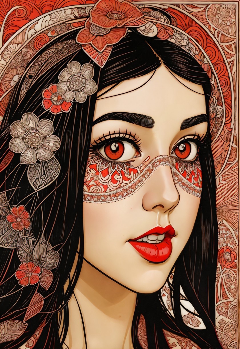 Art Nouveau portraiture, stylized Woodblock print, detailed lineage forms female head, headshot, cel-shaded, fantasy art style, in the style of Margaret Keane and Florianne Becker. Zentangle line, triadic color scheme red white black, hues, embossed with cracks, high coloring 1.9, tints of 1970s advertising art, 3d art, Synthetic essence, tints of geometrical art, back-lit, effects 1.8, streamline_moderne, anisotropic filtering 1.7, intricate details, shadow mapping 1.8, dynamic lighting 1.7, vibrant strokes, maximalism, grain, radiance, highly detailed ornamental, bright, back-lit, luminous plasticity 1.6, illustrative stylization 1.6, hues, highly chipped peeling, dynamic lighting 1.7, high coloring 1.4, vector 9:7, soft edges, light hues, highly chipped background, geometrical, stacked lines, bold lines, vibrant lineage, smooth lines, intricate details of lineage, raytraced shadows 1.8, sublime, mood, occult, brightness 1.9, dynamic lighting 1.7, ((vaporwave 1.7, tints of sketch art, octane render), very detailed illustration, abstract 11:9), stylized details, varnish, thick brushed textures 1.7, beautiful composition 1.9, coffinwood 1.7, american gothic 1.9, beautiful composition,