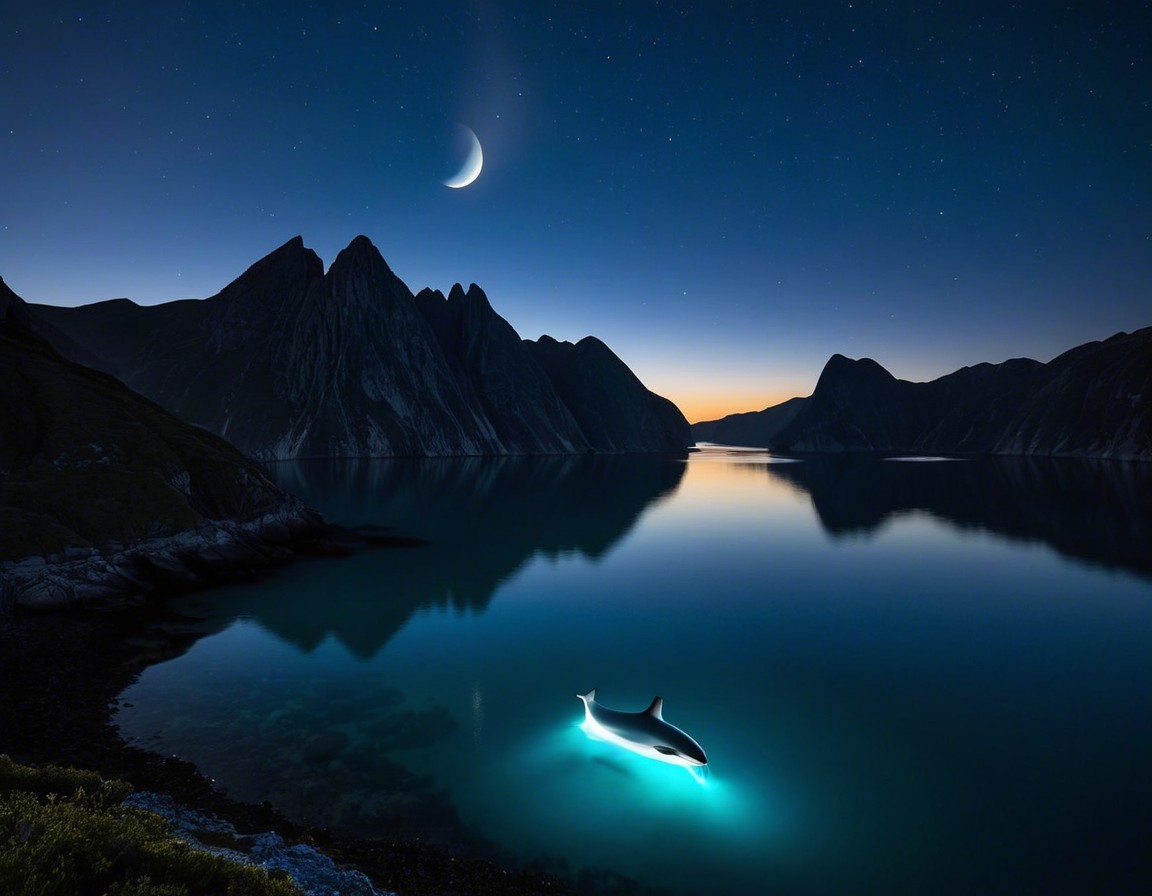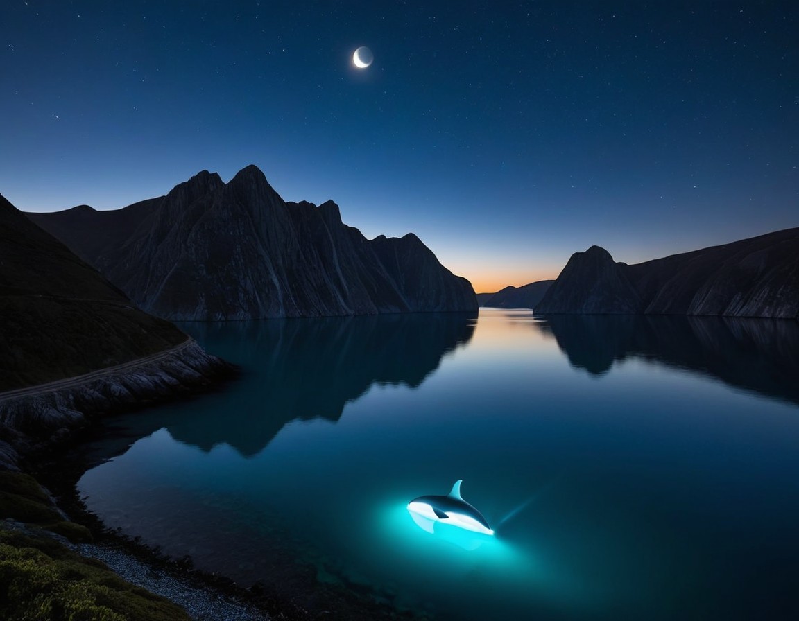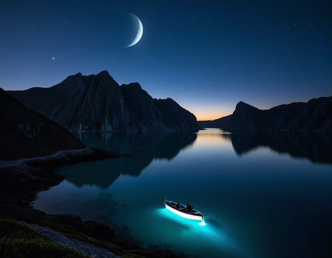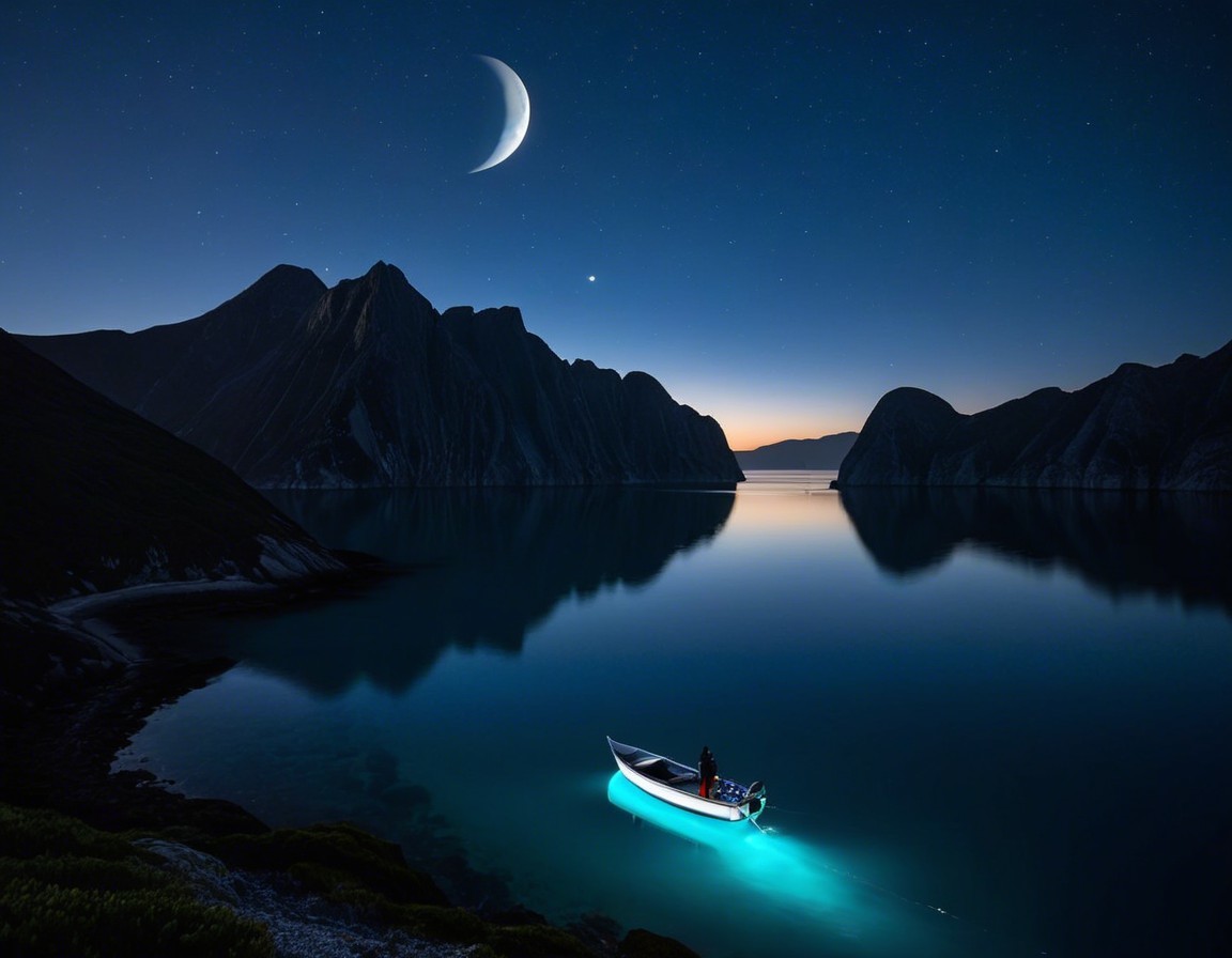 A serene night landscape features a crescent moon illuminating a calm sea. A small boat with glowing lights floats near dramatic cliffs, surrounded by a starry sky and tranquil waters.