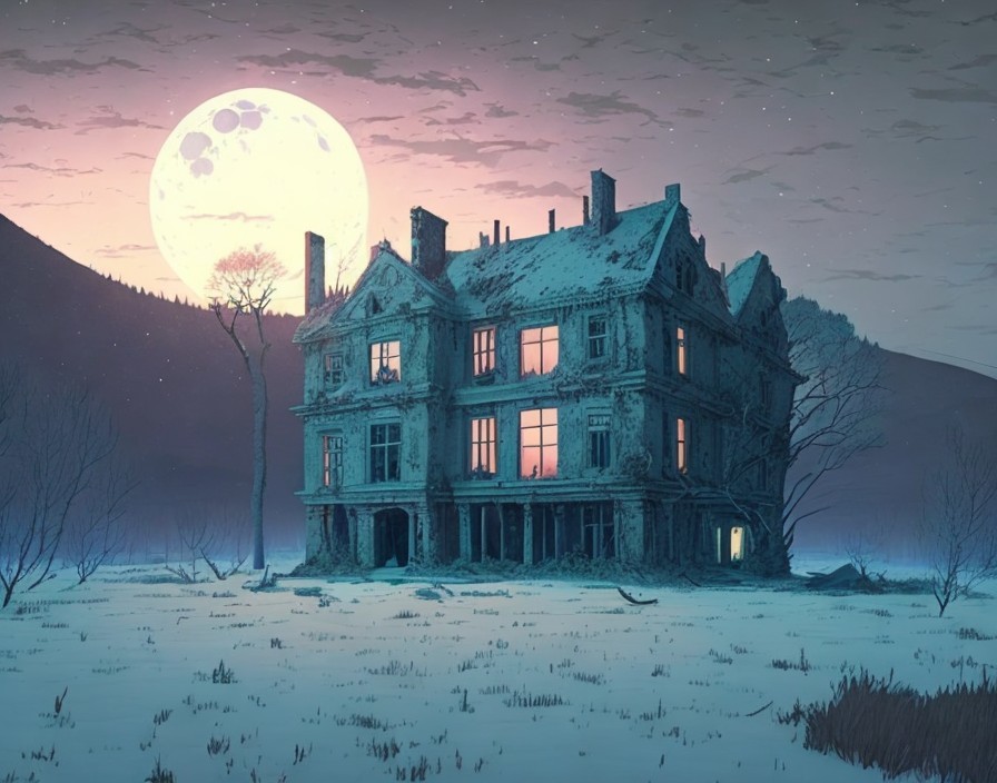 An eerie, dilapidated mansion stands under a full moon in a wintry landscape, casting a haunting glow amidst the desolation.