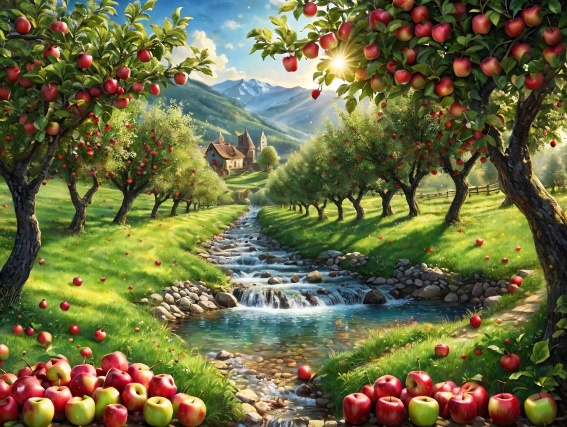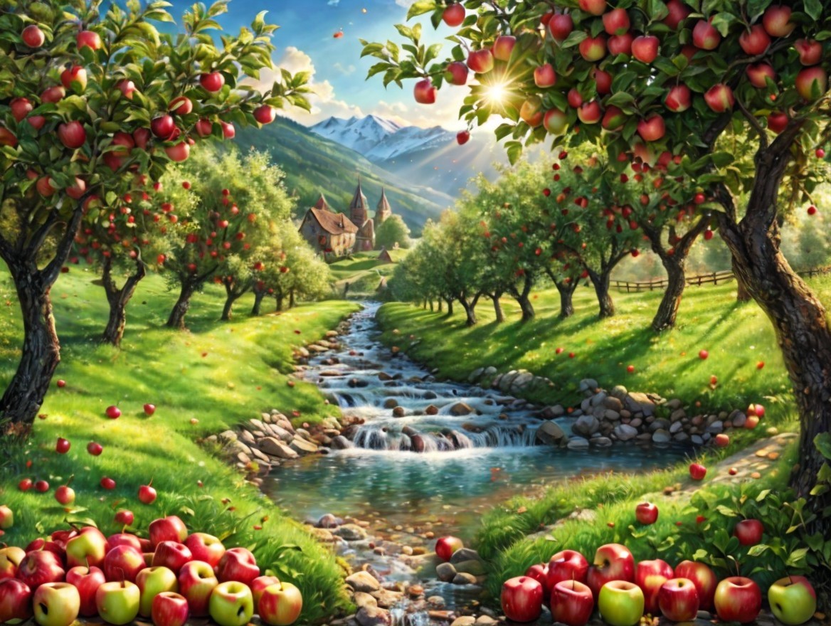An idyllic landscape with apple trees, a streaming brook, mountains in the background, and a small house under a sunny sky.