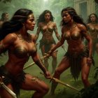 Prompt: "Mighty Amazonian warriors, fierce and powerful, in intricate revealing armor, engaged in a dynamic battle, lush jungle setting, ancient ruins in the background, weapons gleaming, intense expressions, muscular and athletic builds, long flowing hair, diverse skin tones, fantasy art style, detailed and vibrant colors, dramatic lighting casting shadows, digital illustration, high resolution, by Boris Vallejo and Julie Bell, Artstation."