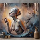 A serene, ethereal woman with platinum hair sits thoughtfully, holding a paintbrush. She is draped in soft fabrics, surrounded by art supplies and a golden vase, set against a dreamy, abstract background.