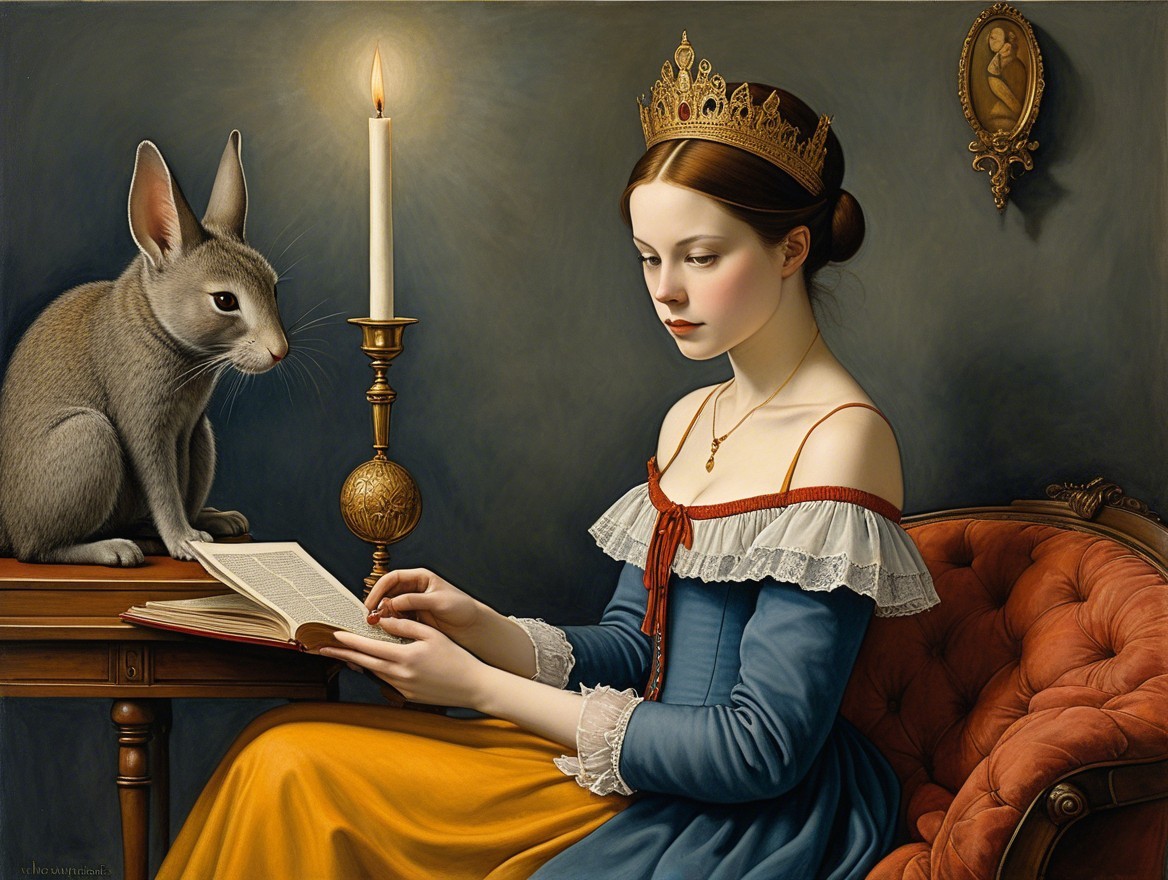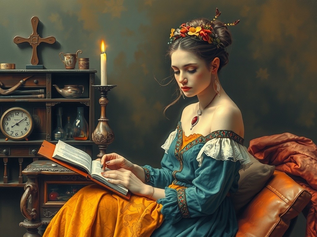 A woman in a blue dress reads a book, two cats on a desk, and a full moon in the background.