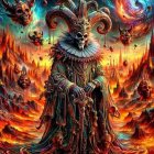 A majestic fantasy figure adorned with intricate armor and a regal crown, holding a torch. The backdrop features vibrant landscapes with towering castles and a dramatic sky, evoking a magical realm.