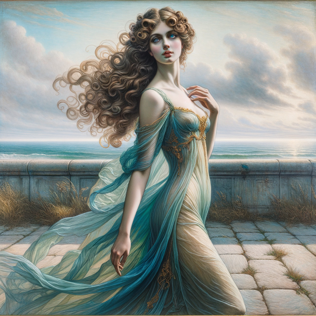 Prompt: wide-angle full-body candid painting featuring a stunning statuesque Pre-Raphaelite beauty walking and swaying in an oceanfront breeze, precisely defined facial features, highly detailed azure eyes, luxurious hair with Botticelli curls, cupids-bow lips, wearing gently flowing gossamer silk dress in blues and greens with gold accents and golden shoes. On a pathway leading away from the Mediterranean coast