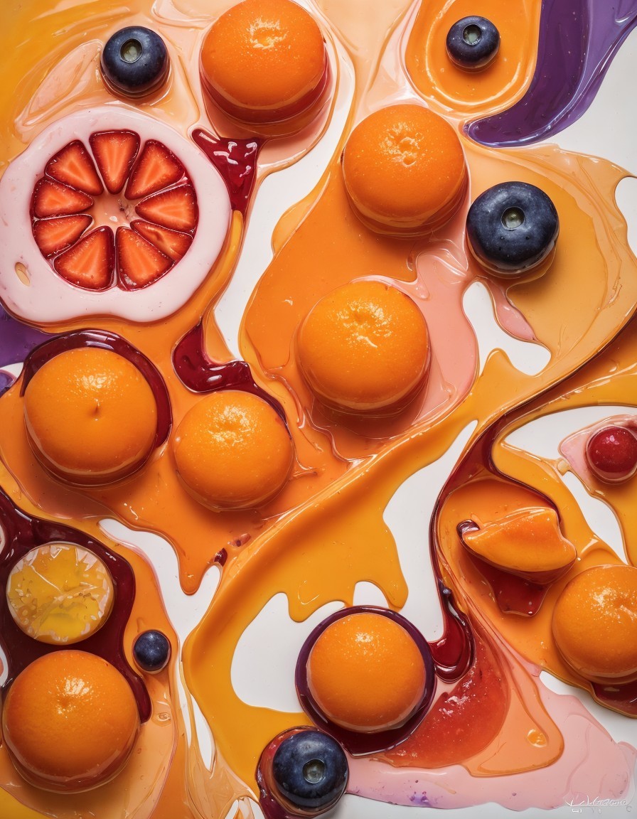 Colorful, artistic array of fruits embedded in swirled, creamy textures with vibrant drizzles, presenting a mix of orange slices, berries, and abstract shapes.