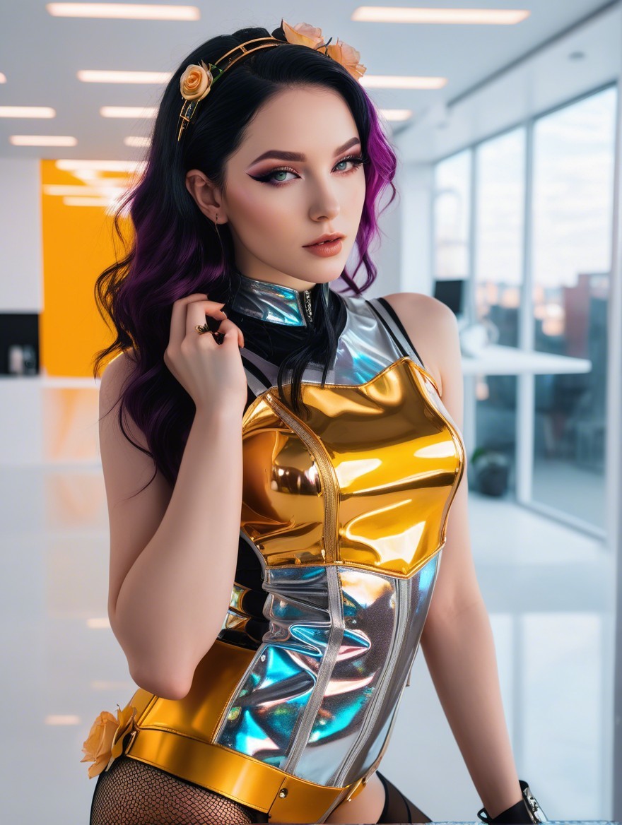 A futuristic scene featuring a woman in a sleek, golden robotic outfit. She holds a pair of high-tech goggles, set against a modern, minimalist office background. Her striking blue eyes captivate.