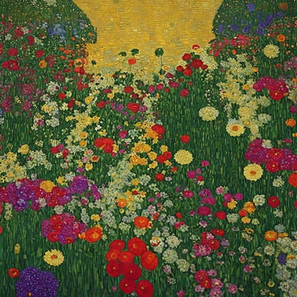 A vibrant field of wildflowers in full bloom, featuring an array of colors including yellow, red, pink, and purple. Tall green grass surrounds the blossoms, creating a lively, serene atmosphere.