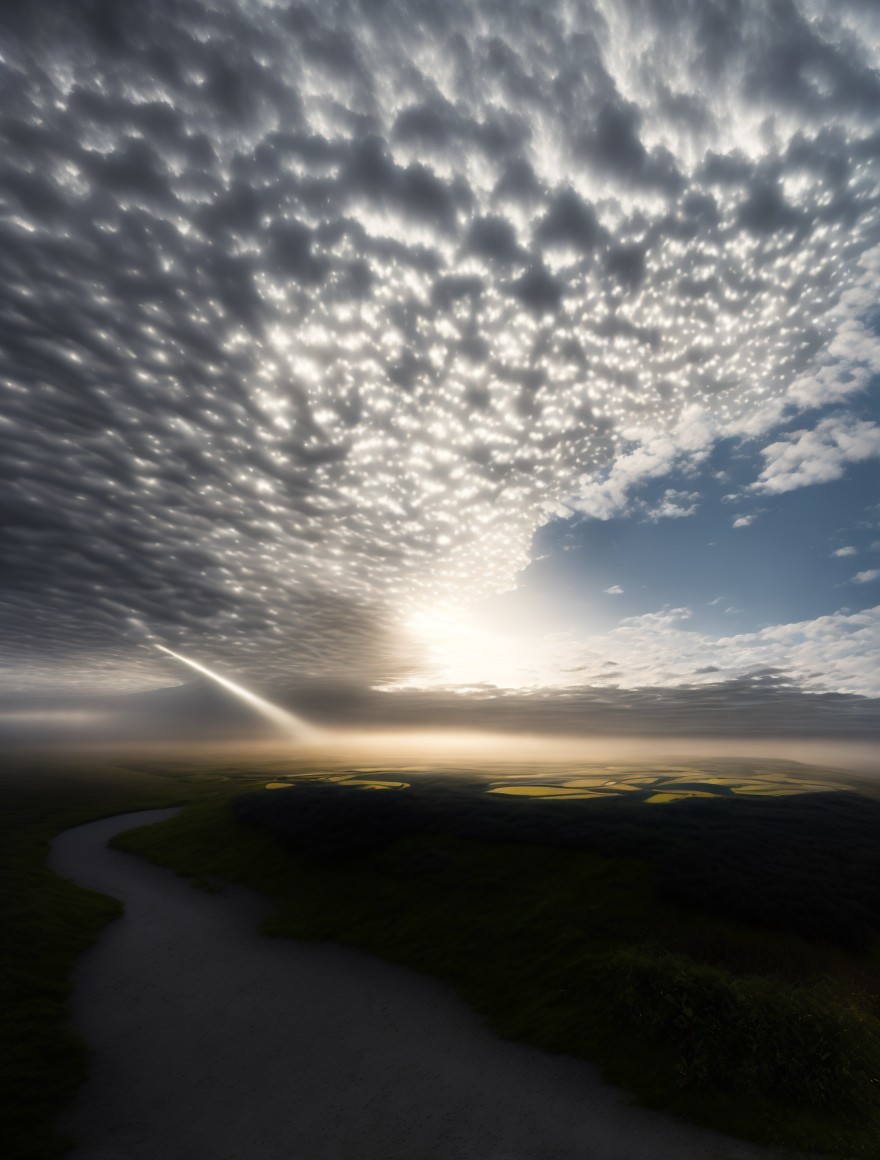A dazzling sunset over a mountainous landscape with a unique patterned sky illuminated by numerous bright specks of light.