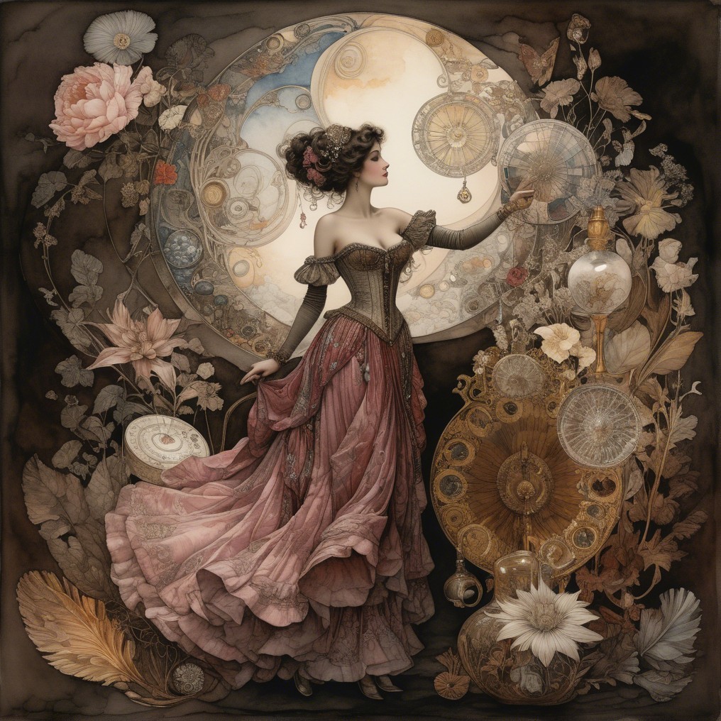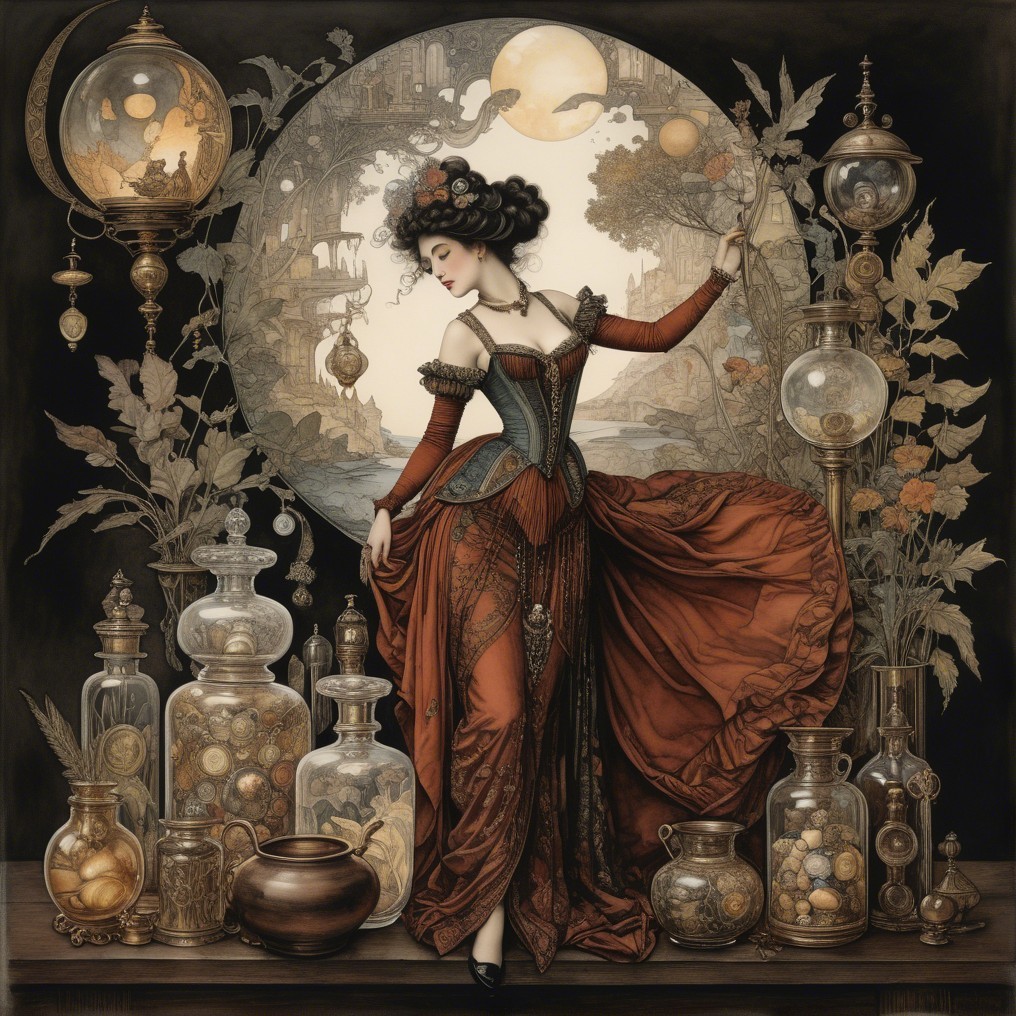 A woman in a Victorian dress stands among ornate glass jars filled with flowers and liquids. Behind her is a large, intricate wheel of vintage illustrations, enhancing the mystical atmosphere.