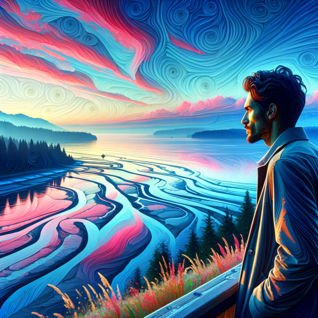 A person gazes at a vibrant sunset with pink clouds reflected on a serene sea, surrounded by mountains.