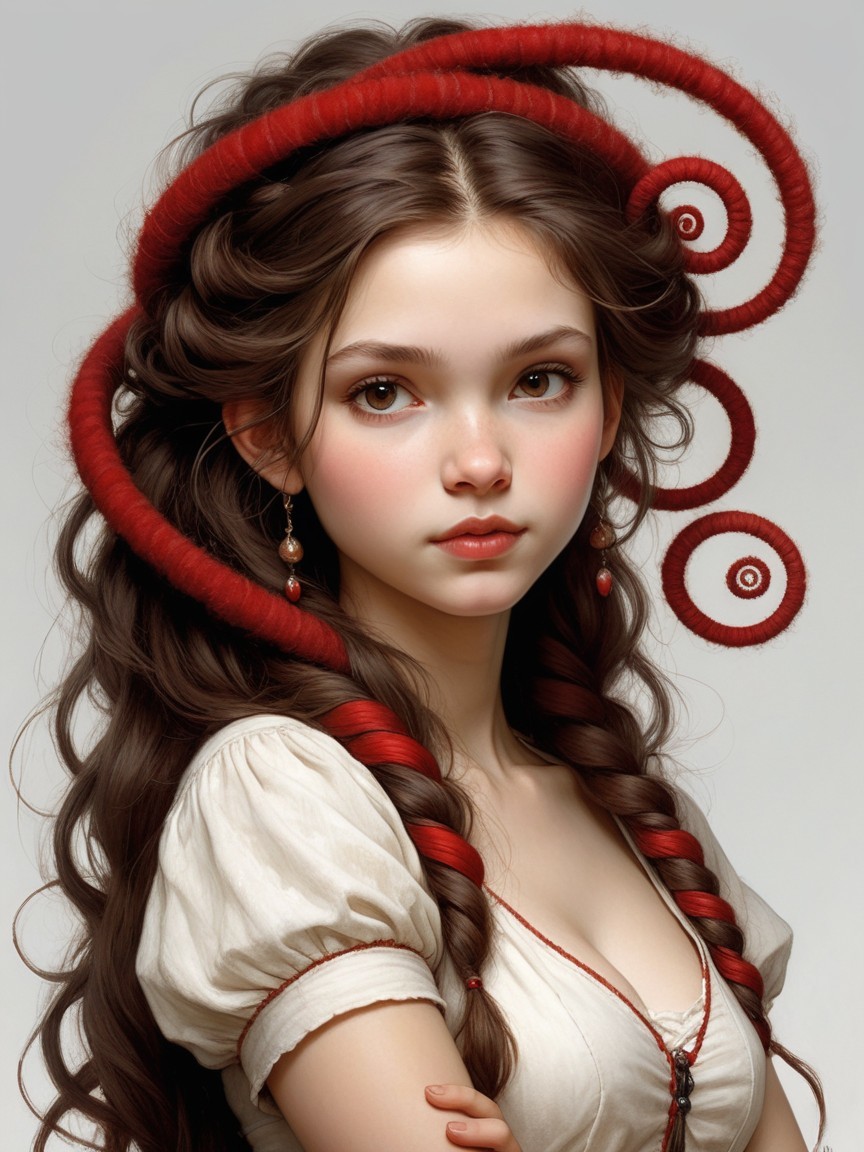 Artist Jean-Baptiste Monge style. A red-white fluffy spiral-shaped spiral-headed Girl."Create a captivating, realistic portrait in a modern, bohemian, high-fashion style. Depict a lovely young woman with long, straight dark brown hair and a very narrow waist. Capture her in a graceful, full-body standing pose. Her skin has a soft, glossy, oiled sheen. She wears a unique multi-element outfit: high-waisted, extremely wide-leg, flowing palazzo pants made from a fabric with a multi-colored tie-dye pattern in shades of blue, pink, and yellow. Paired with a simple, fitted, black, off-the-shoulder, long-sleeved crop top. An ornate, golden belt cinches her very narrow waist. She wears numerous layered gold necklaces with large, blue stone pendants.\n\nThe background is a soft, abstract, out-of-focus and atmospheric painting, with textures of yellow, pink, and brown. The scene is lit by a warm, golden backlight. The scene is captured in a photorealistic style with ultra-detailed, high-resolution clarity. Incorporate elements of medieval, baroque, and renaissance aesthetics, emphasizing féminité and grâce. Add glamour and aesthetic inspiration from Soufiane Idrassi and Edwardian Avant Garde fashion.\n\nFor an additional layer of complexity, imagine a vibrant and colorful bohemian fashion photoshoot featuring a woman wearing a stunning turquoise dress with intricate floral embroidery and beadwork. The dress is adorned with detailed patterns in pink, orange, and green hues, with tassels and lace trimming adding to the elegant design. She is accessorized with large turquoise statement earrings and a multicolored beaded necklace.\n\nHer hair is styled in a voluminous updo decorated with bold orange and pink flowers, complemented by green feathers. The setting features a pastel turquoise background with a rustic door, creating a tropical and artistic atmosphere. The overall mood is lively, exotic, and full of intricate details, with a sensual mood and soft lighting.\n\nApply an infrared filter (1.8) to enhance the glamorous and aesthetic appeal. Ensure the final image is a masterpiece, best quality, with a captivating portrait revealing clothes, sensual, and a low-key background. The overall ambiance should evoke magic and enchantment, capturing the essence of féminité and sensual allure."