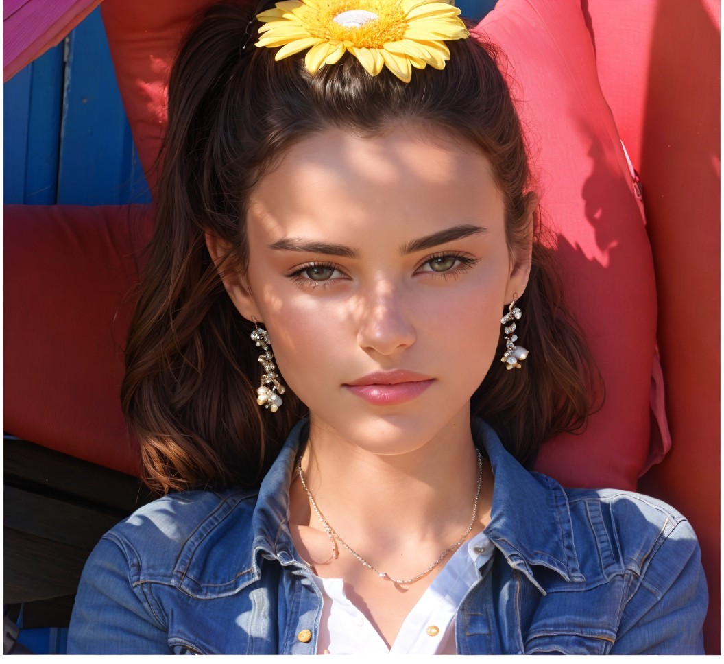 Woman with Sunflower in Hair Surrounded by Pink and Red Flowers