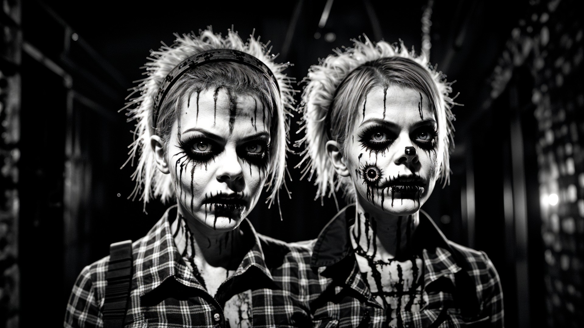 Two eerie figures in black and white, with painted faces resembling dolls. Their expressions are haunting, featuring dripping makeup and unsettling glances, enhancing the spooky atmosphere.