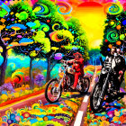 Two motorcyclists ride along a vibrant, psychedelic road flanked by colorful, swirling trees. The background features a bright sun and a whimsical, dreamlike landscape bursting with colors.