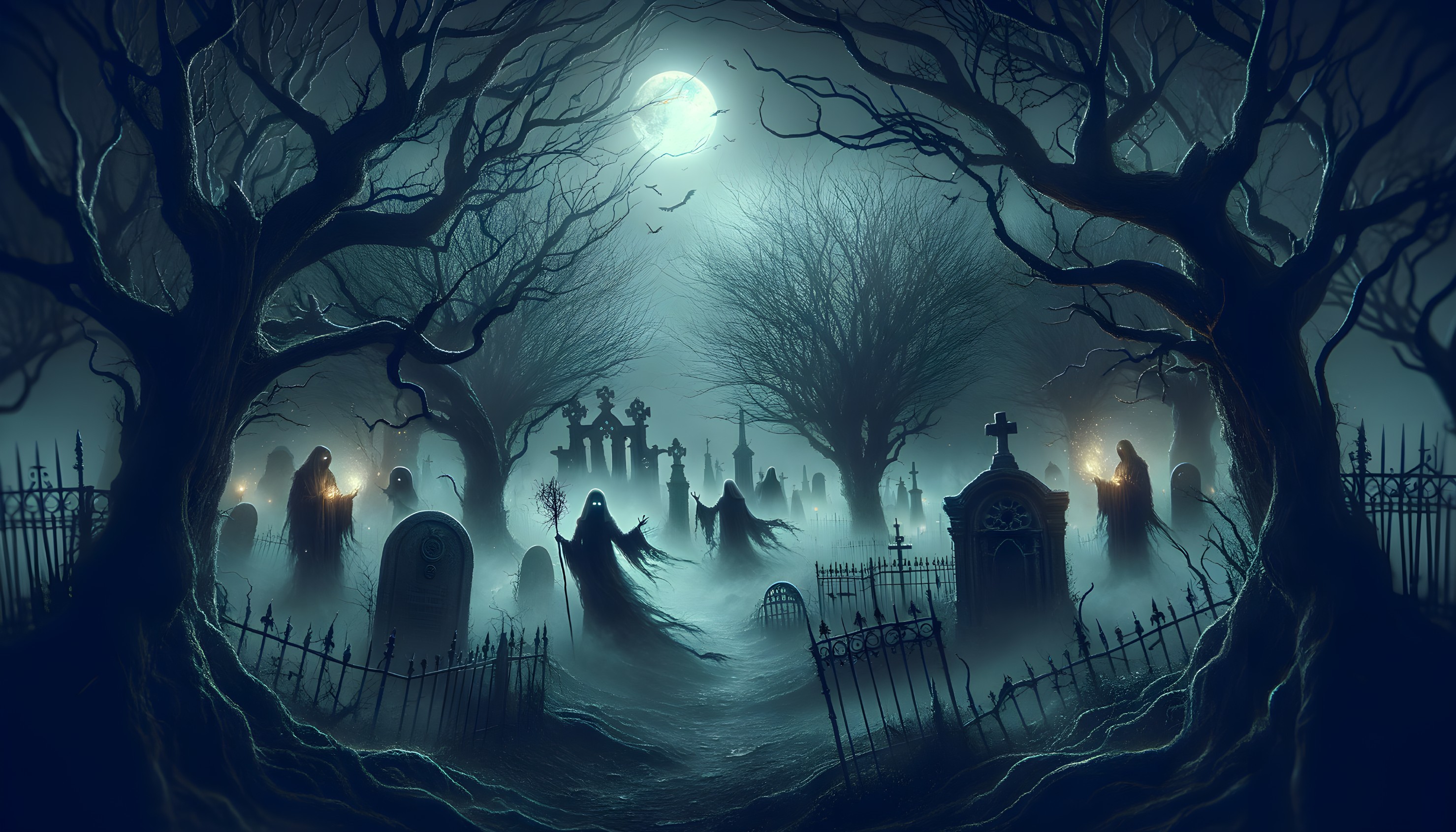 A haunting digital painting depicting an eerie graveyard with twisted trees, ghostly figures, and glowing eyes under a moonlit sky. Dark, surreal, and macabre, with high detail and dramatic lighting.