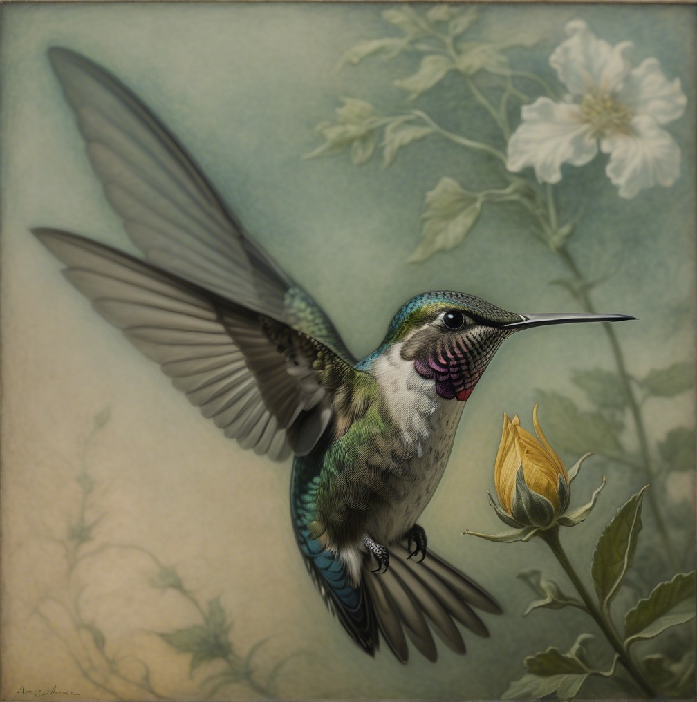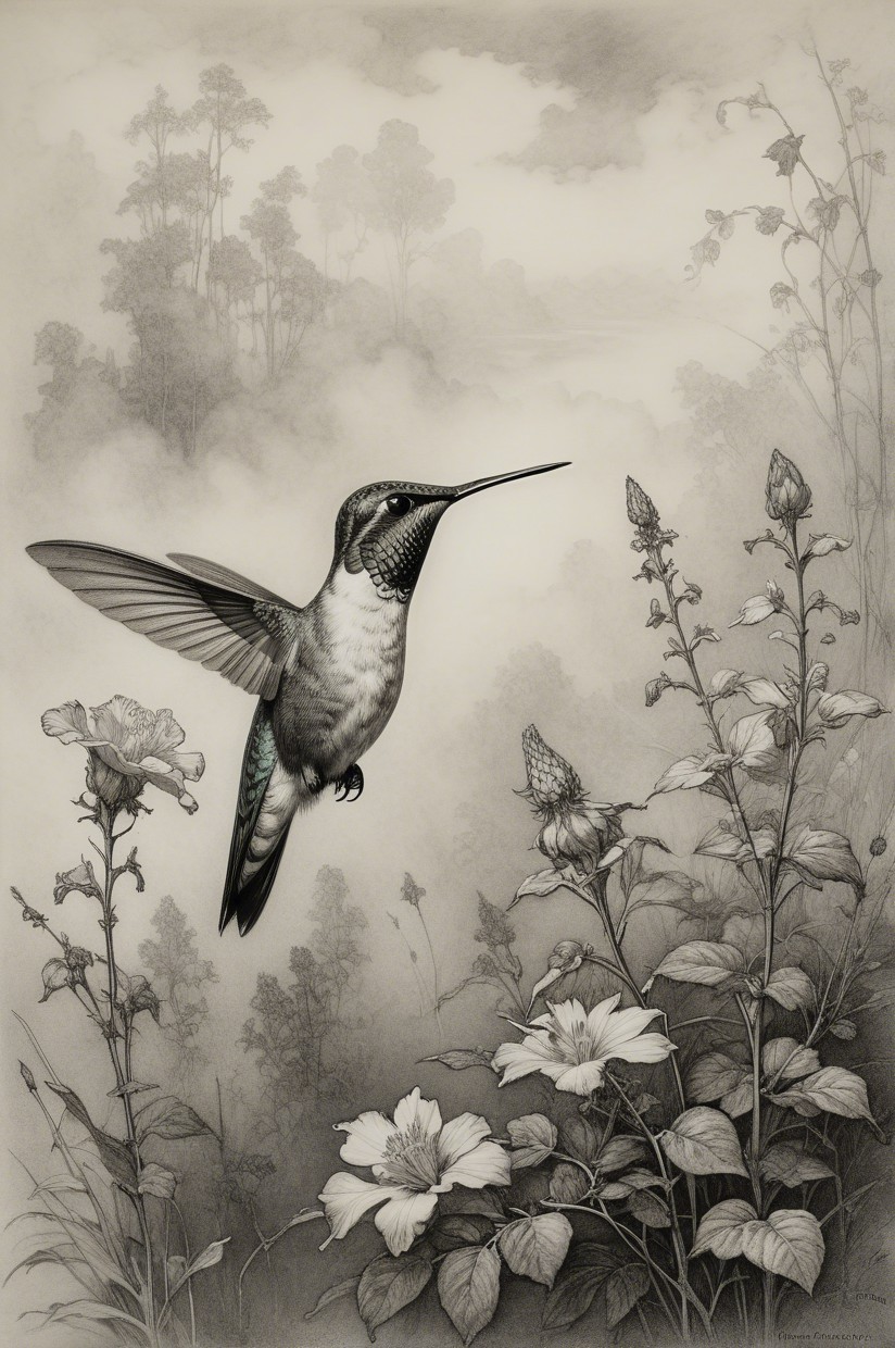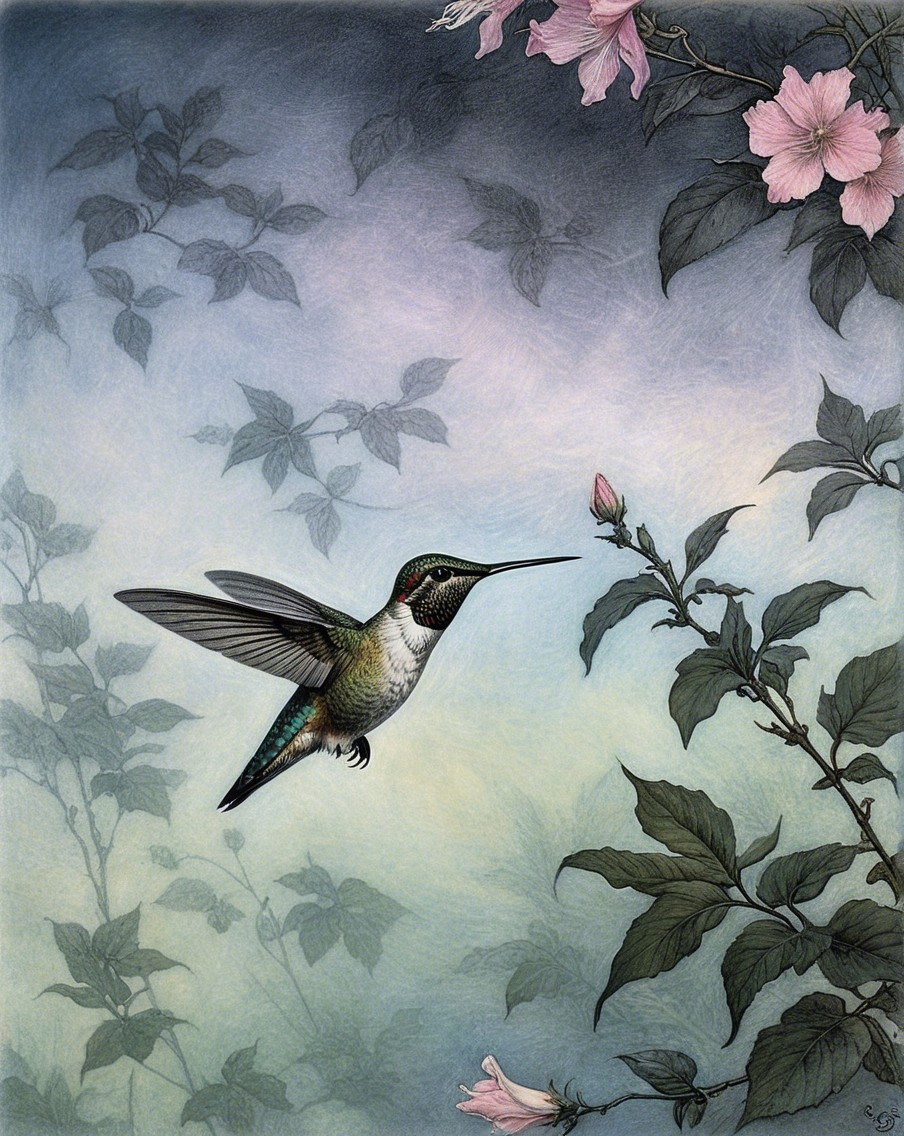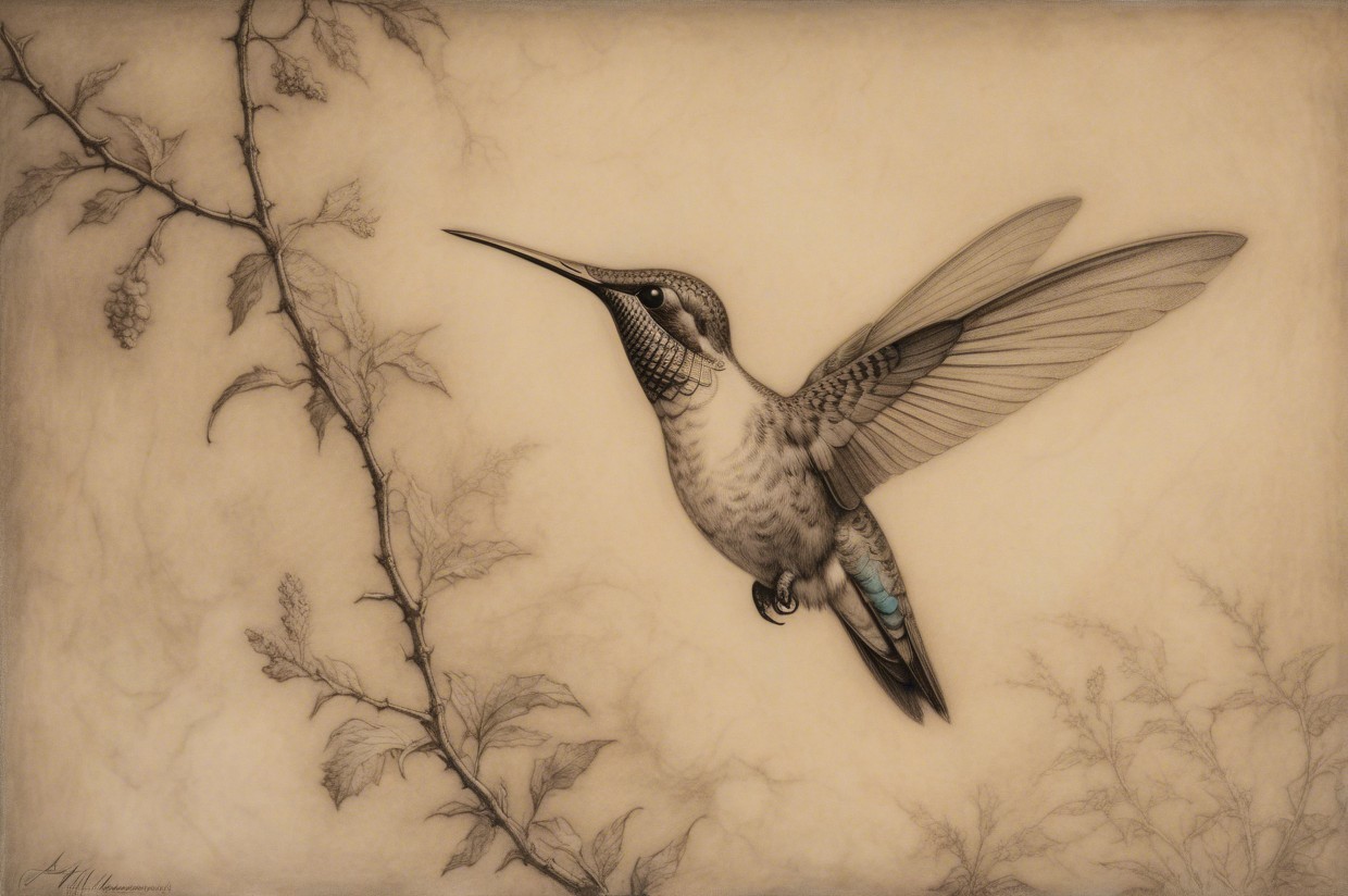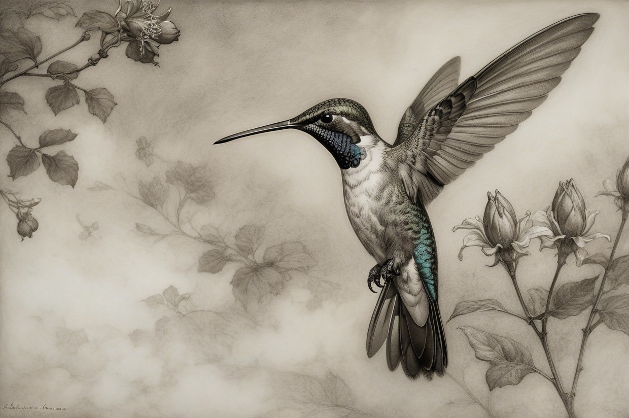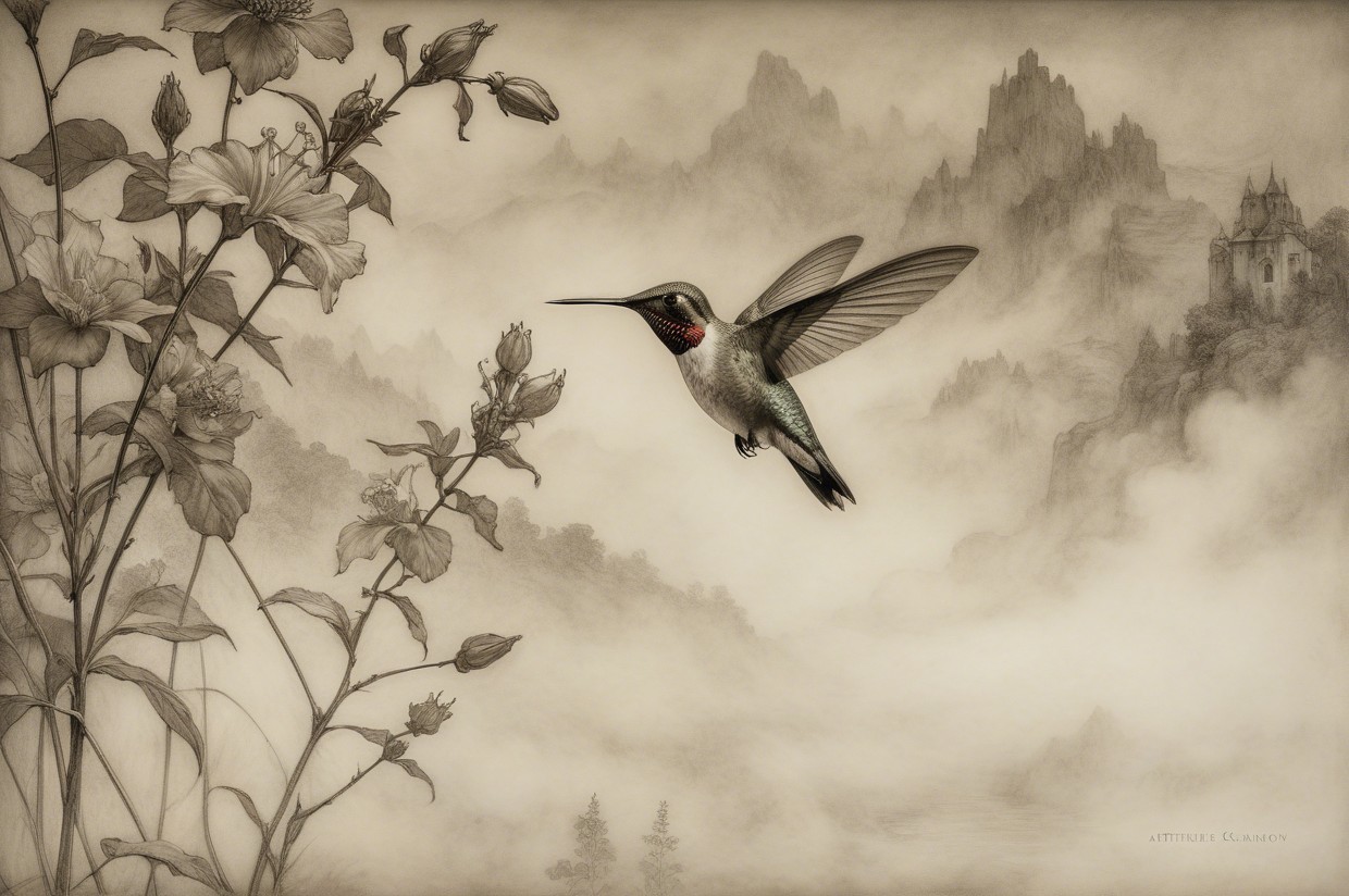 Prompt:  Deeply textured artistic charcoal etched hummingbird, Arthur Rackham, Martin Schongauer, Leonardo da Vinci, Albrecht Dürer, highly imaginative, Arthur rackham, Monet, Van Gogh, early morning mist, floral, 1100s, arthur rackham, Alexei Alexeievich Harlamov, Monet, Maxfield Parrish