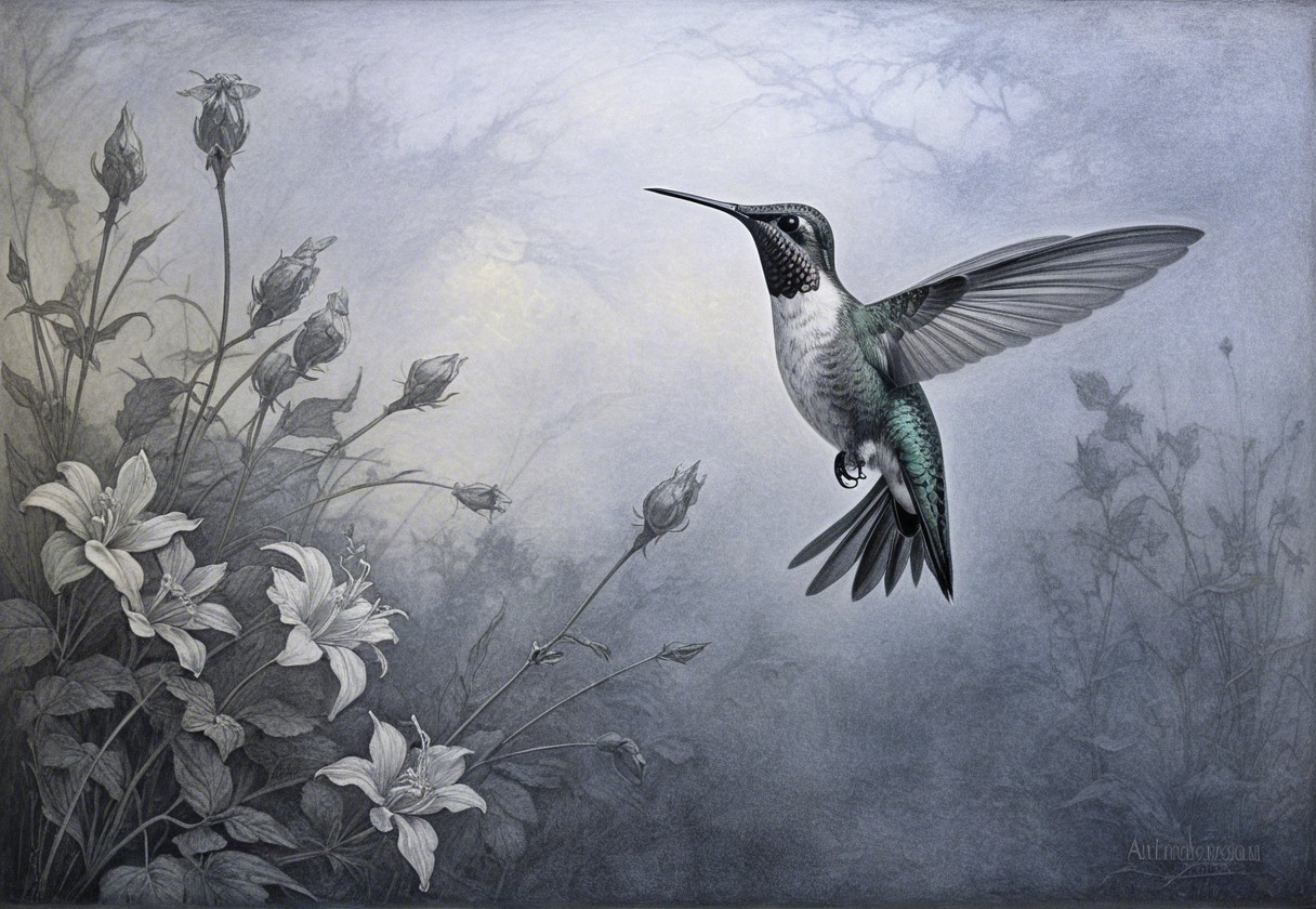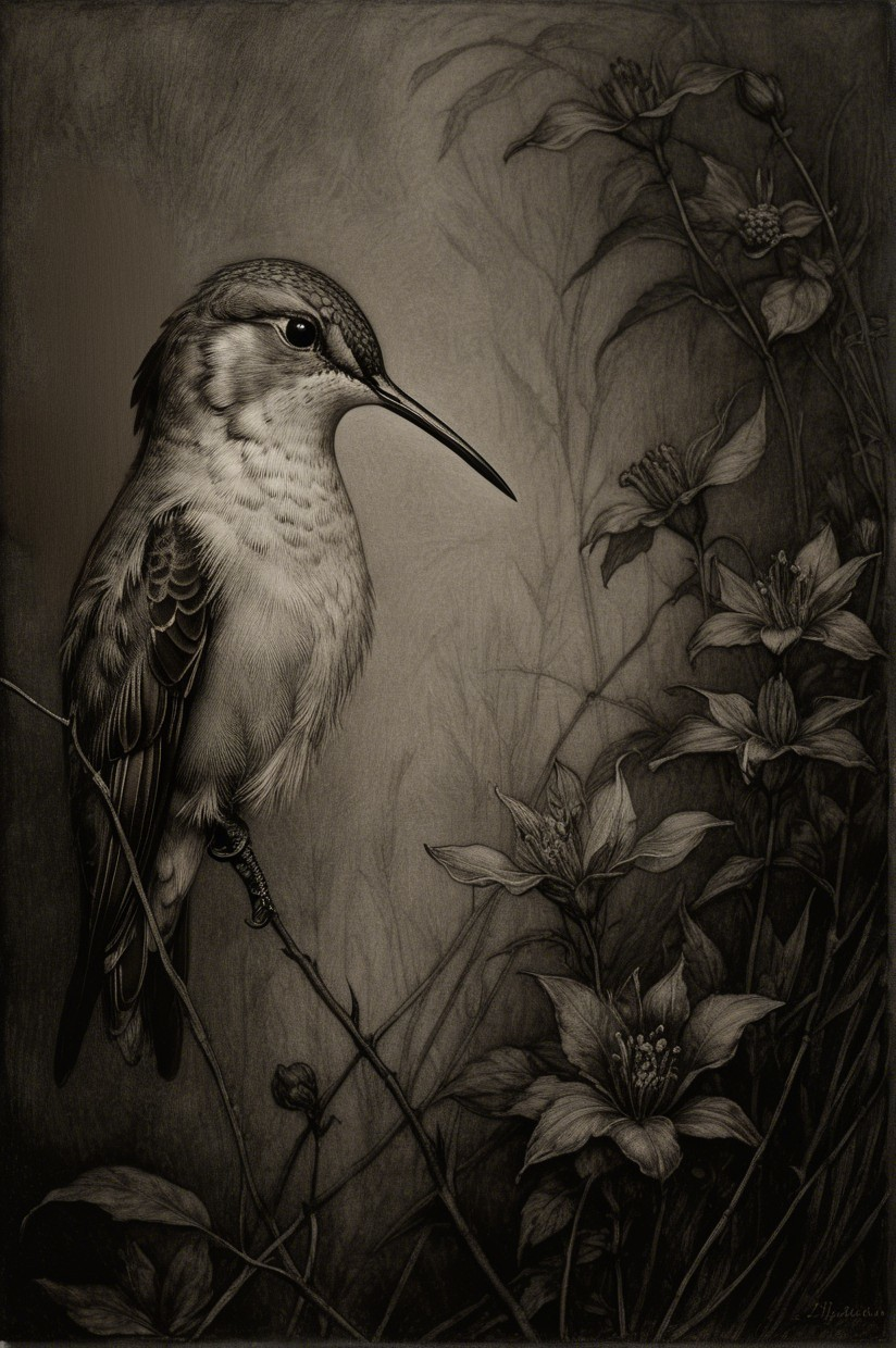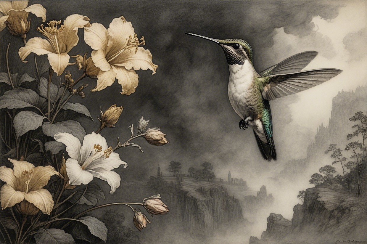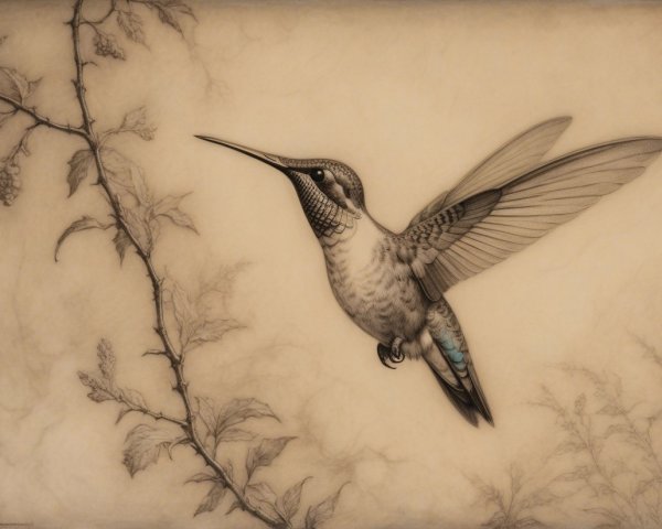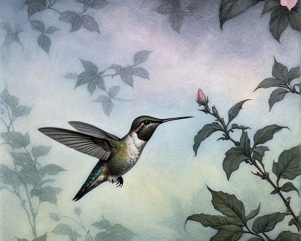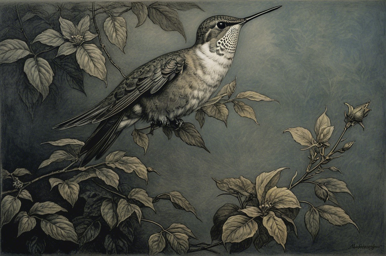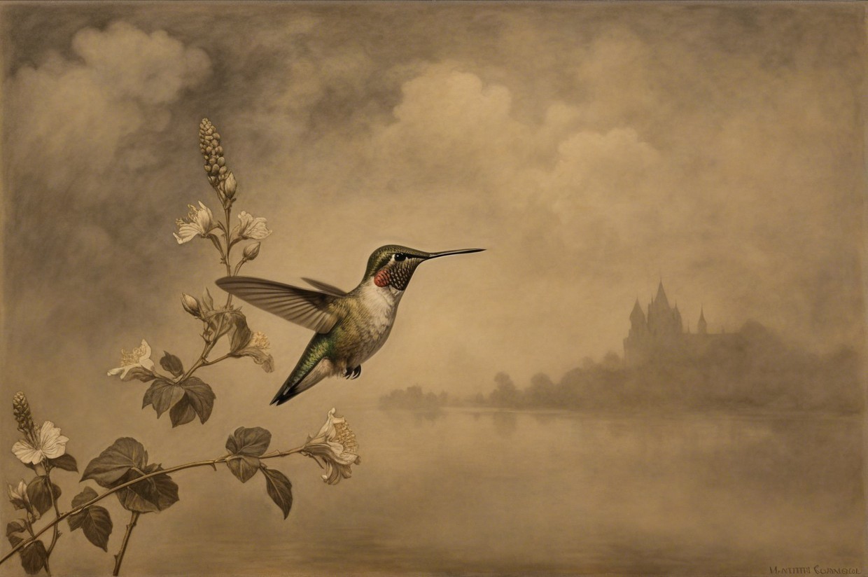 Prompt:  Deeply textured artistic charcoal etched hummingbird, Arthur Rackham, Martin Schongauer, Leonardo da Vinci, Albrecht Dürer, highly imaginative, Arthur rackham, Monet, Van Gogh, early morning mist, floral, 1100s, arthur rackham, Alexei Alexeievich Harlamov, Monet, Maxfield Parrish