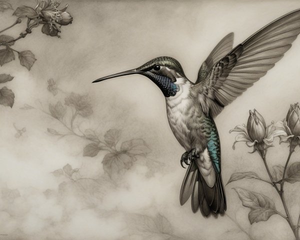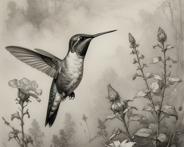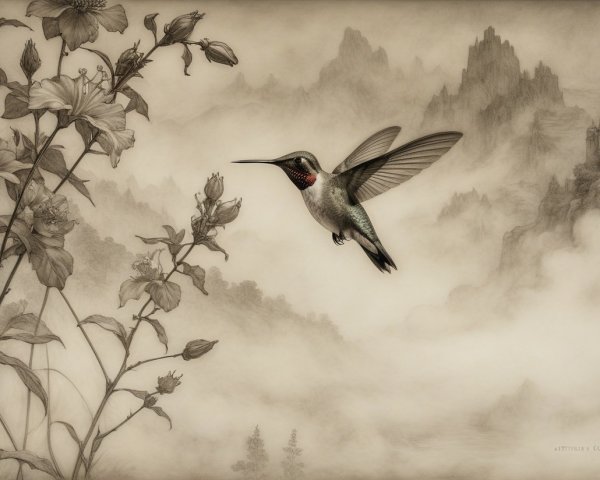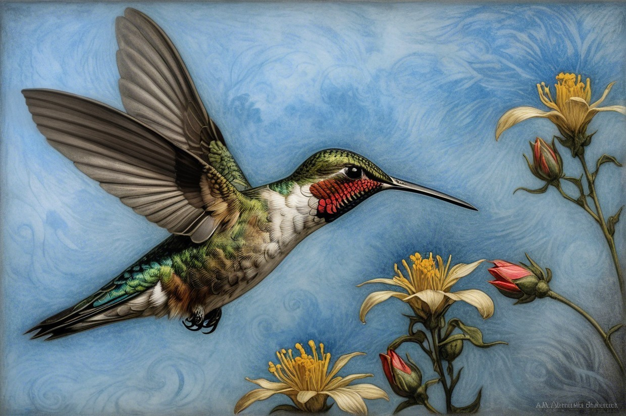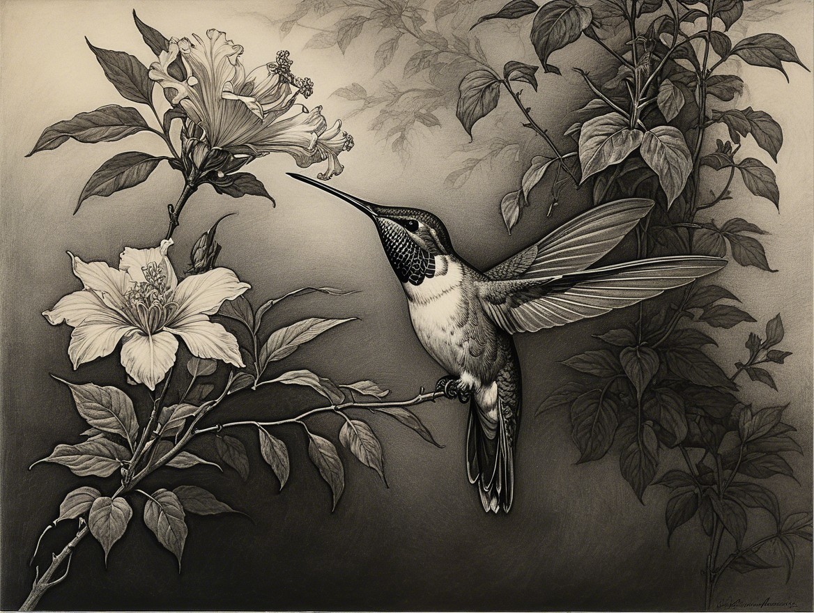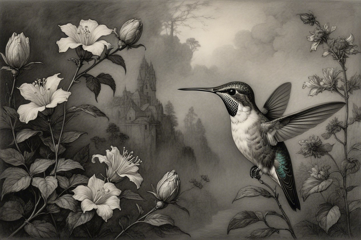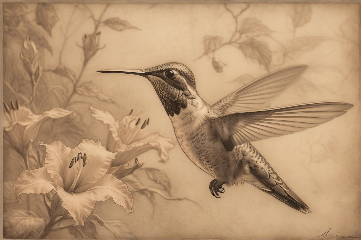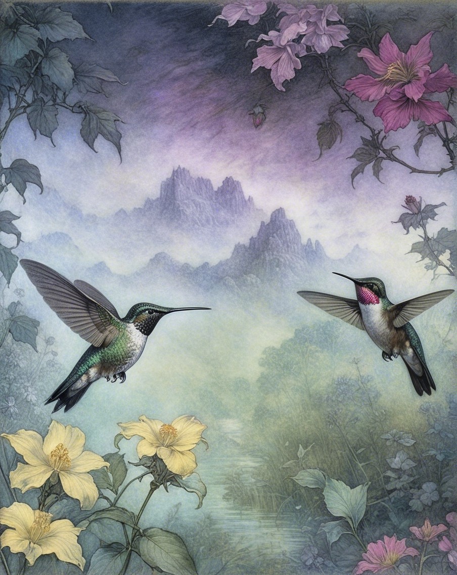Prompt:  Deeply textured artistic charcoal etched hummingbird, Arthur Rackham, Martin Schongauer, Leonardo da Vinci, Albrecht Dürer, highly imaginative, Arthur rackham, Monet, Van Gogh, early morning mist, floral, 1100s, arthur rackham, Alexei Alexeievich Harlamov, Monet, Maxfield Parrish