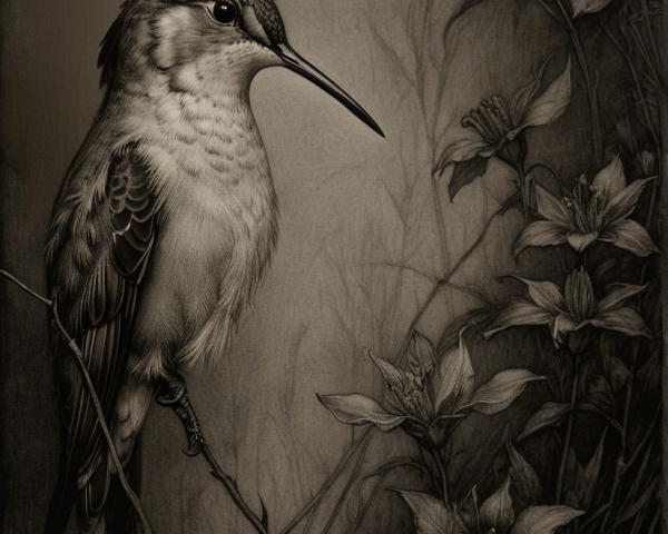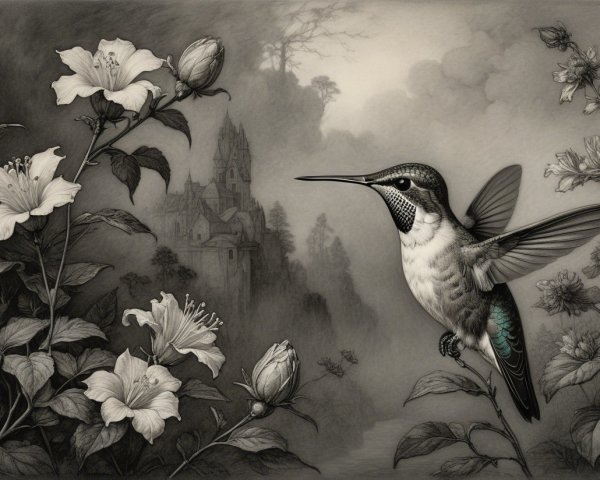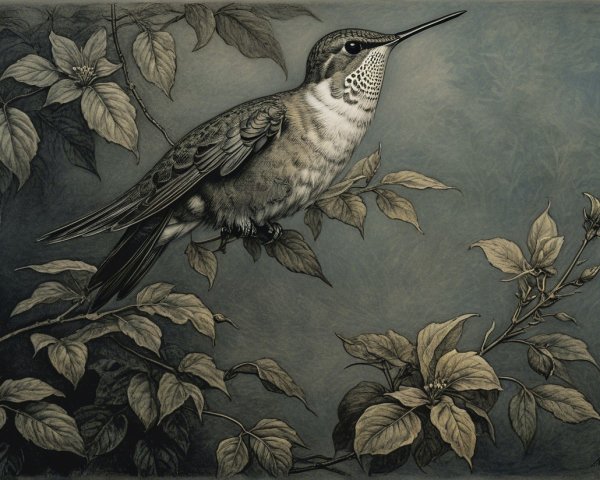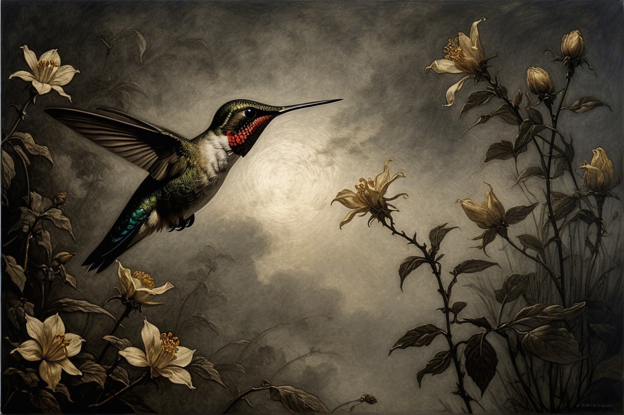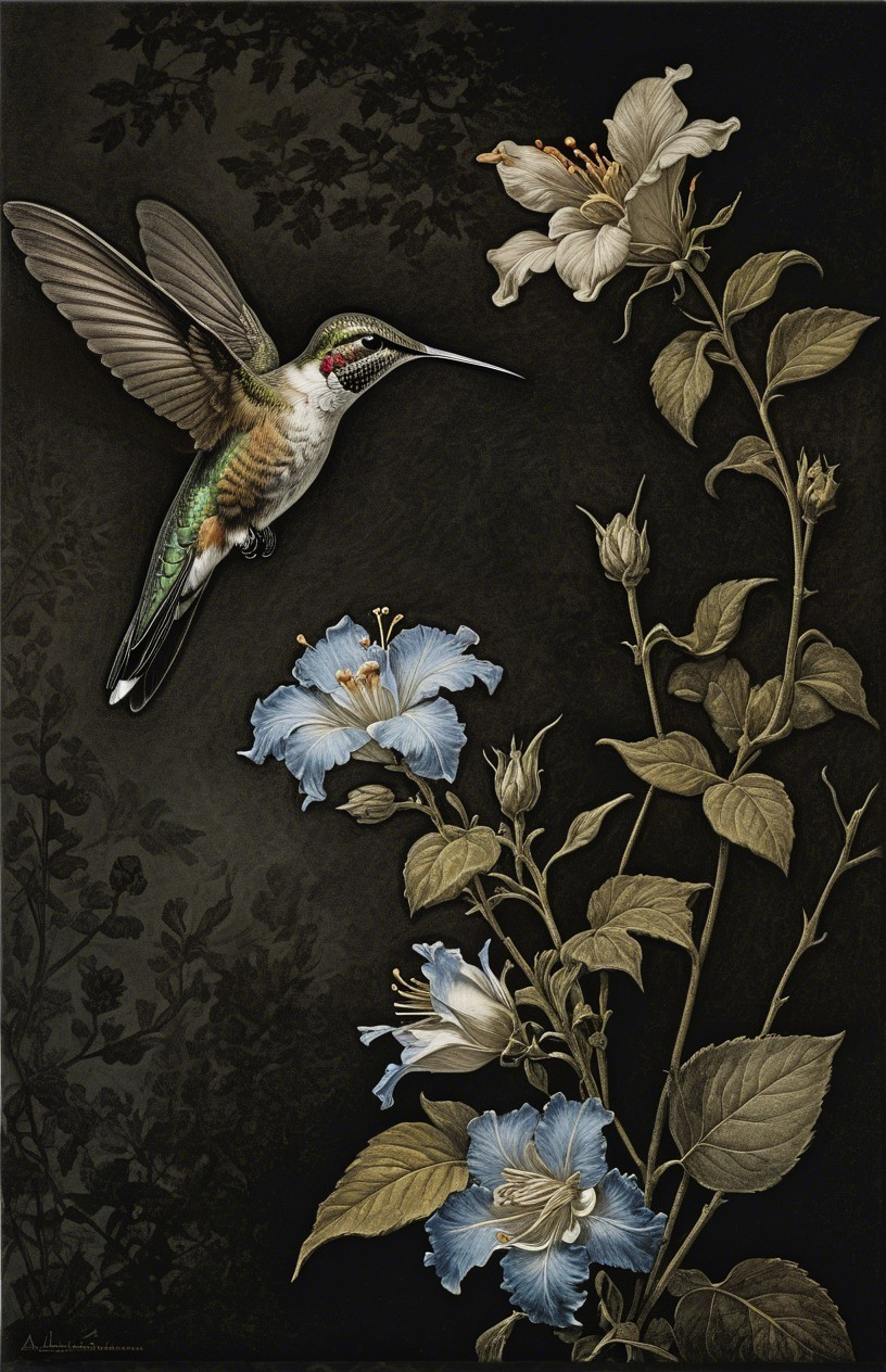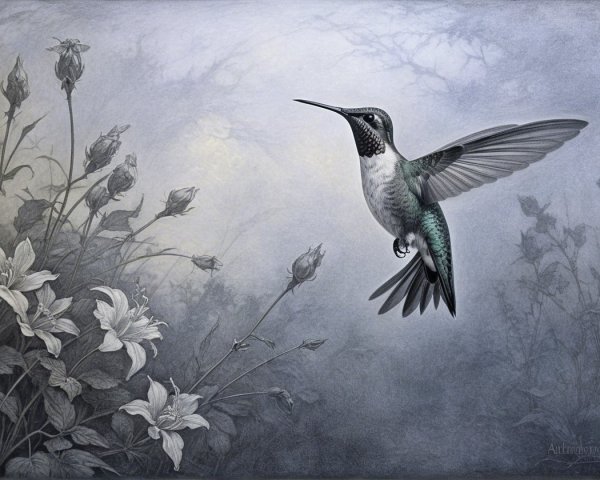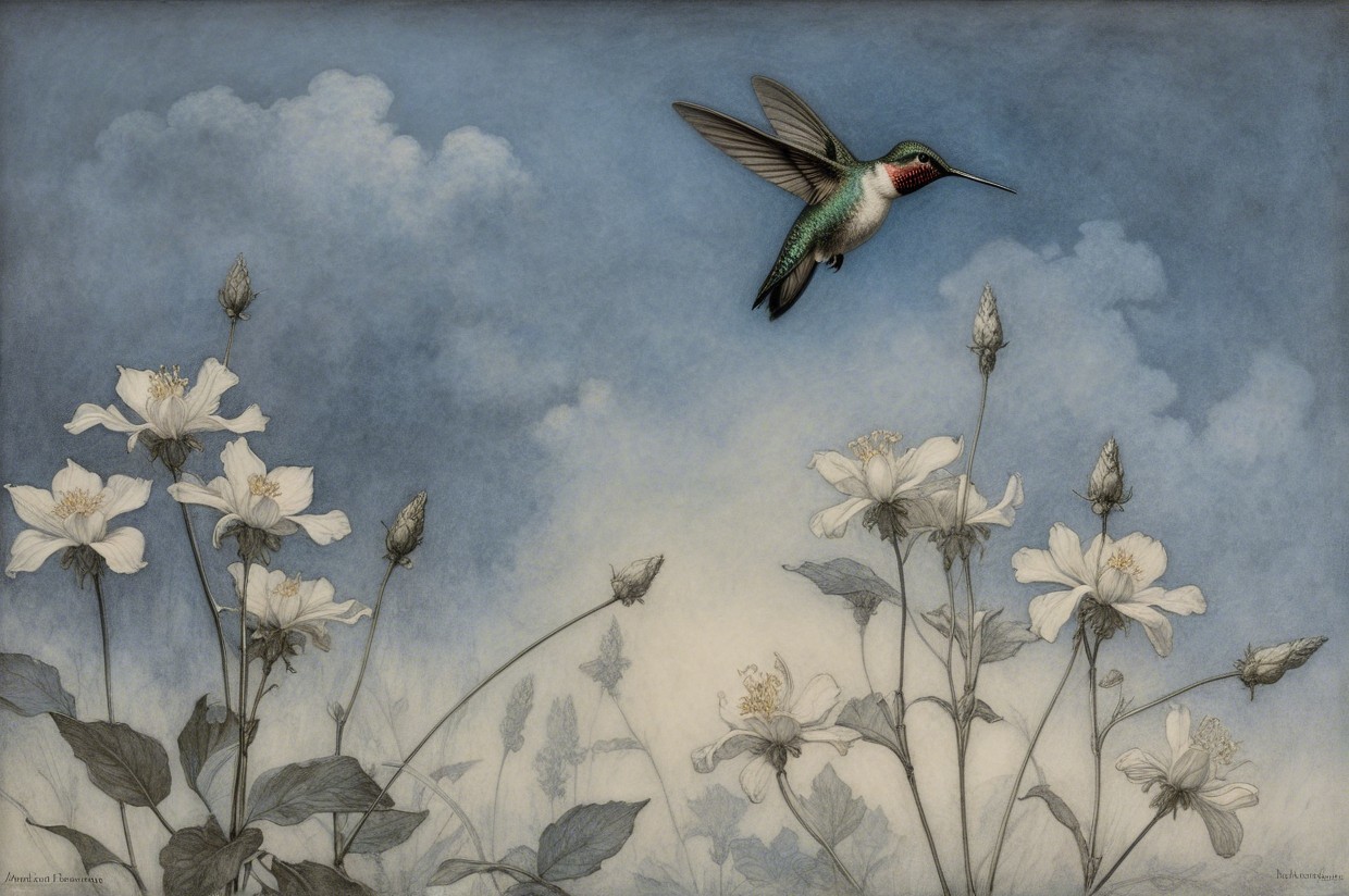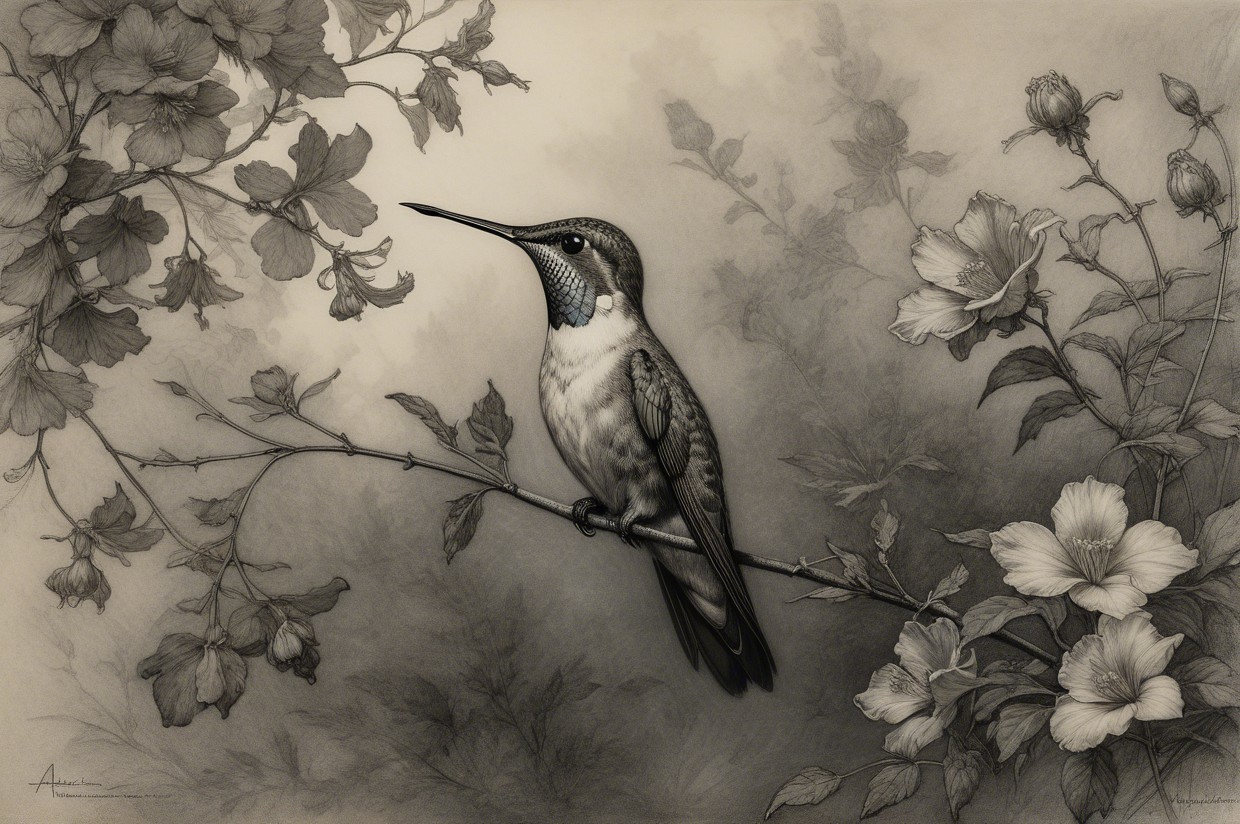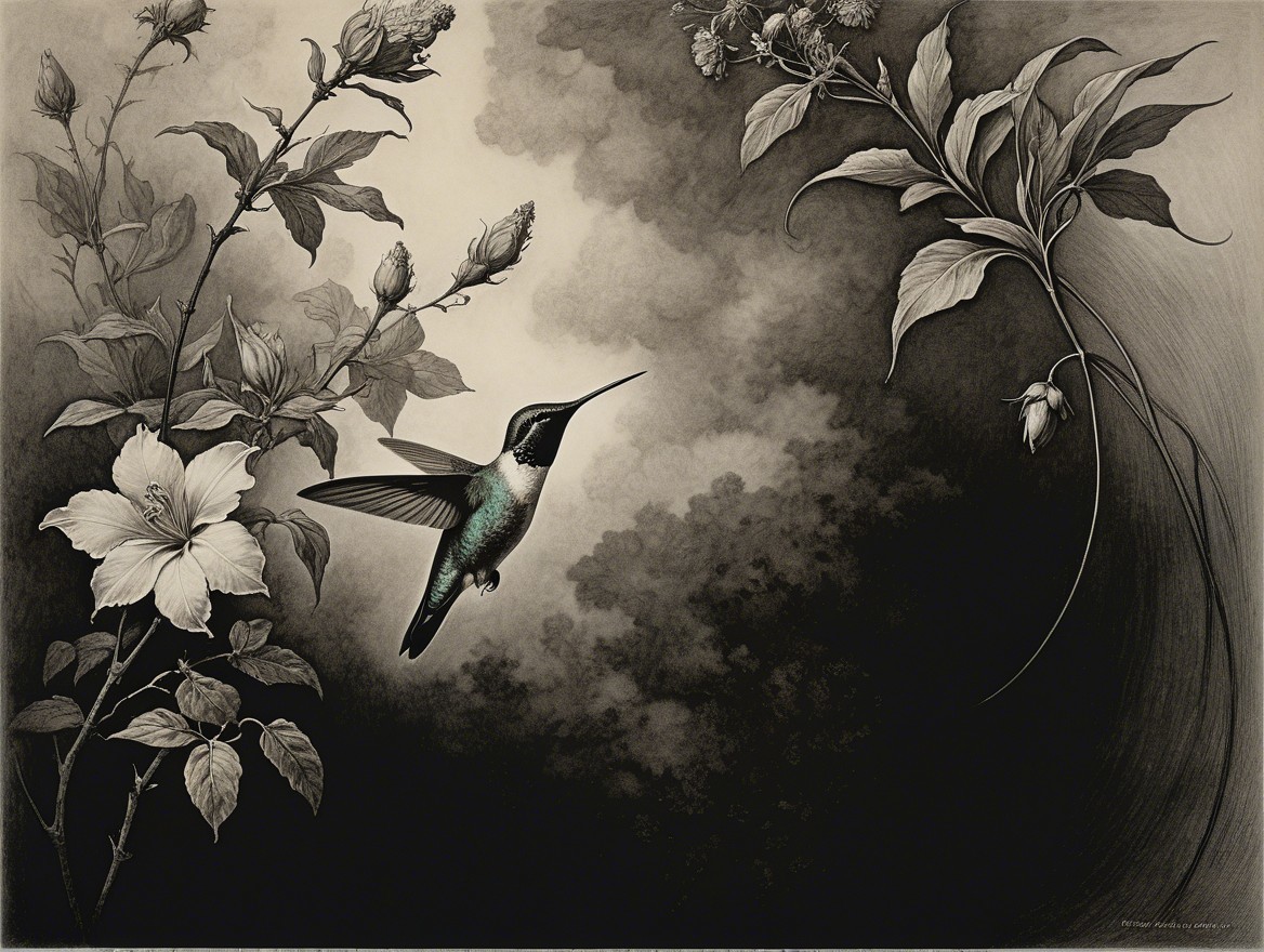 Prompt:  Deeply textured artistic charcoal etched hummingbird, Arthur Rackham, Martin Schongauer, Leonardo da Vinci, Albrecht Dürer, highly imaginative, Arthur rackham, Monet, Van Gogh, early morning mist, floral, 1100s, arthur rackham, Alexei Alexeievich Harlamov, Monet, Maxfield Parrish