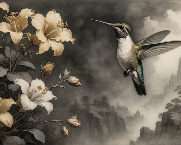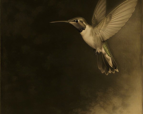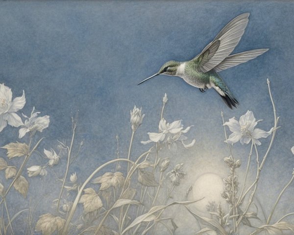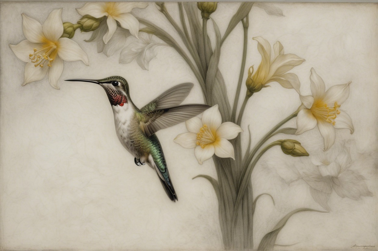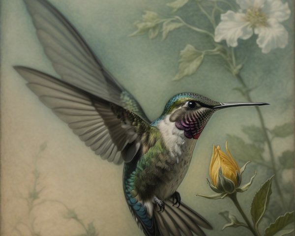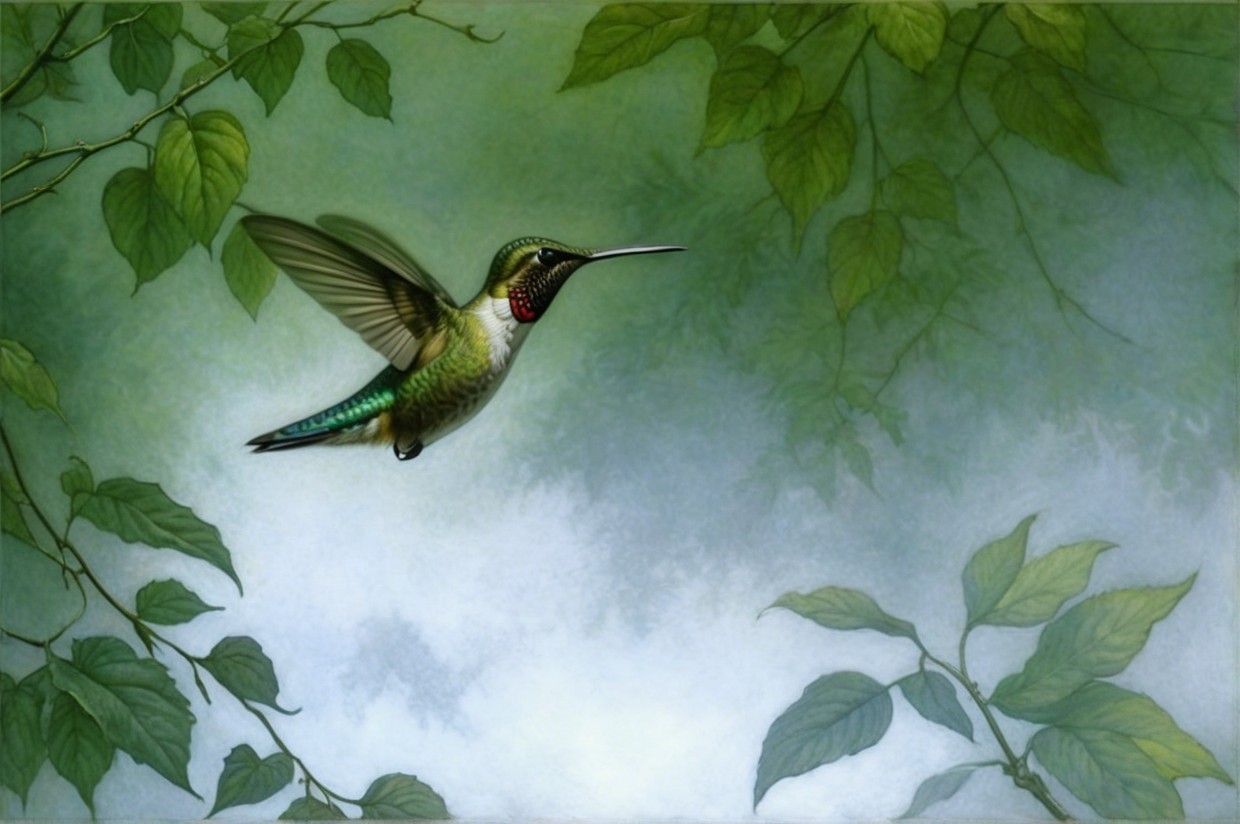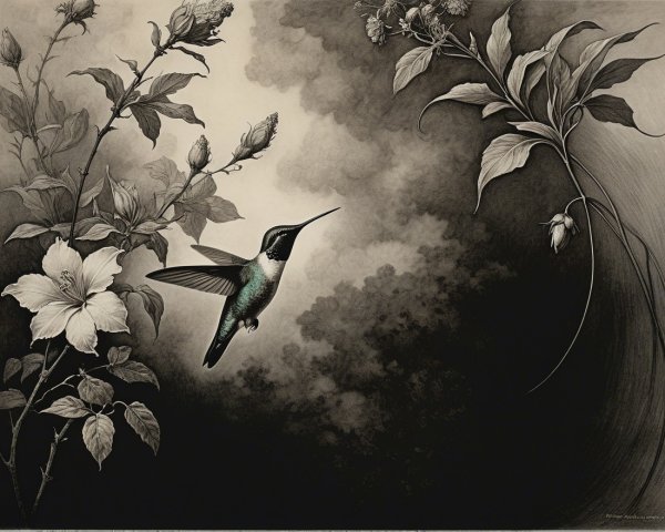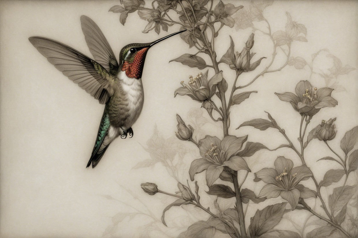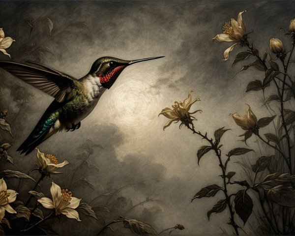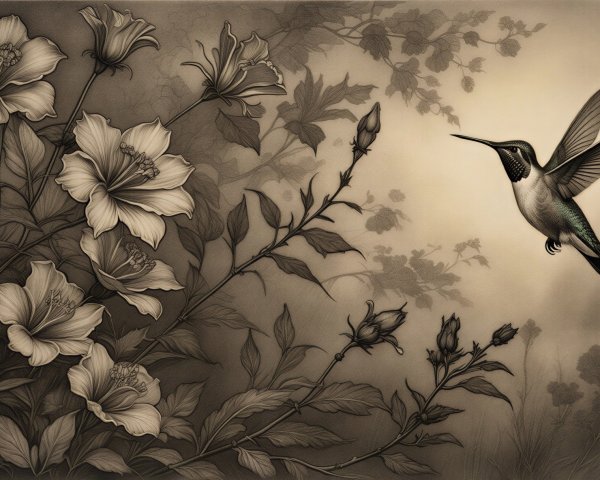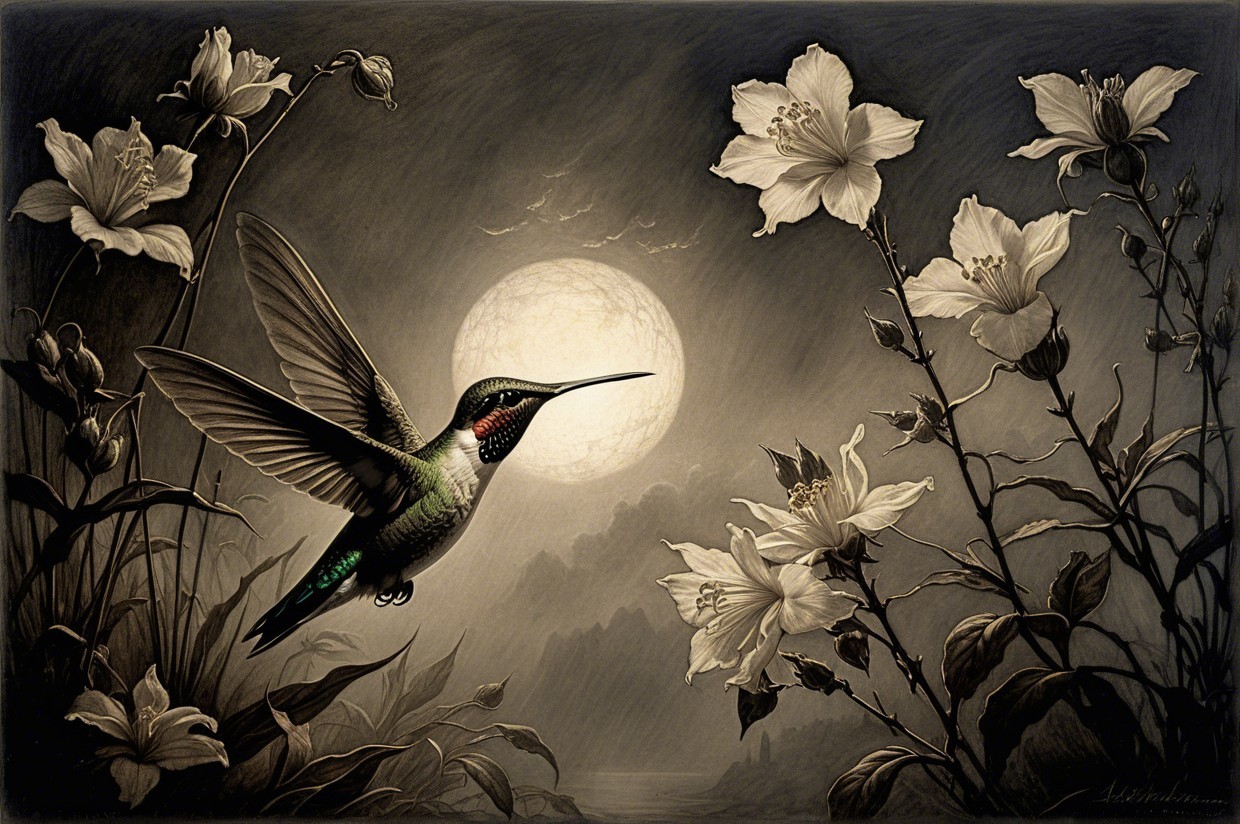 Prompt:  Deeply textured artistic charcoal etched hummingbird, Arthur Rackham, Martin Schongauer, Leonardo da Vinci, Albrecht Dürer, highly imaginative, Arthur rackham, Monet, Van Gogh, early morning mist, floral, 1100s, arthur rackham, Alexei Alexeievich Harlamov, Monet, Maxfield Parrish
