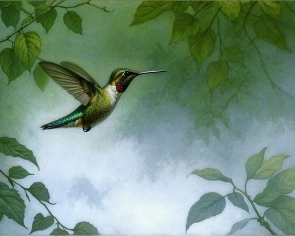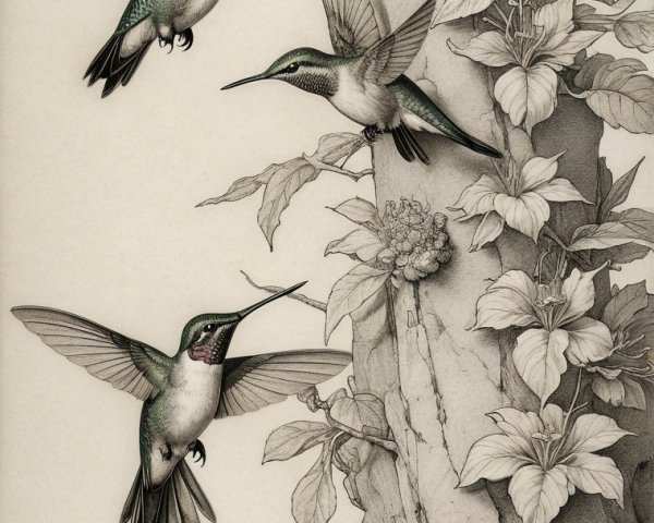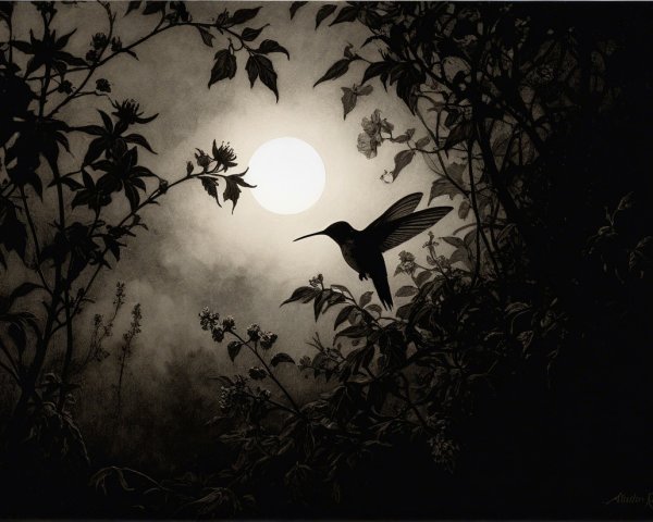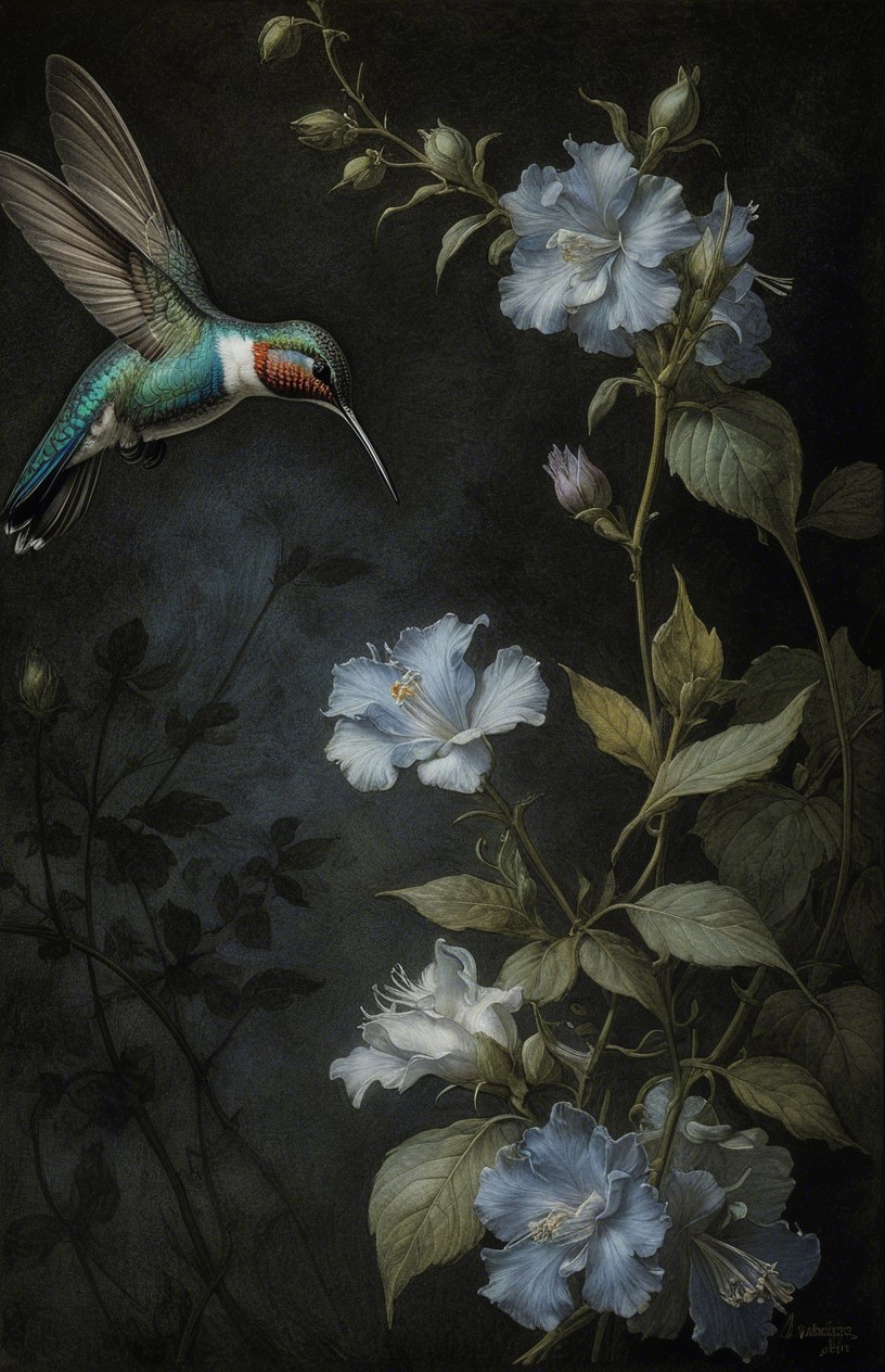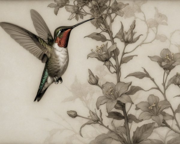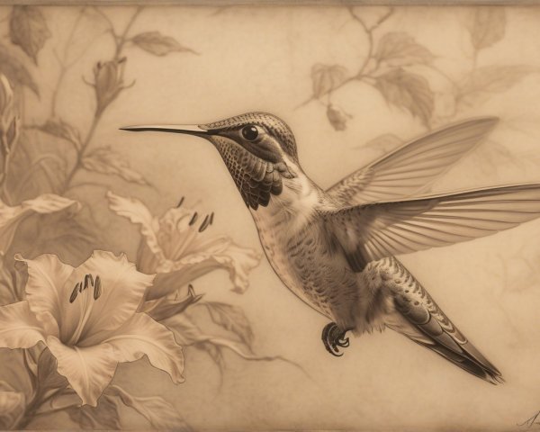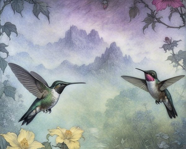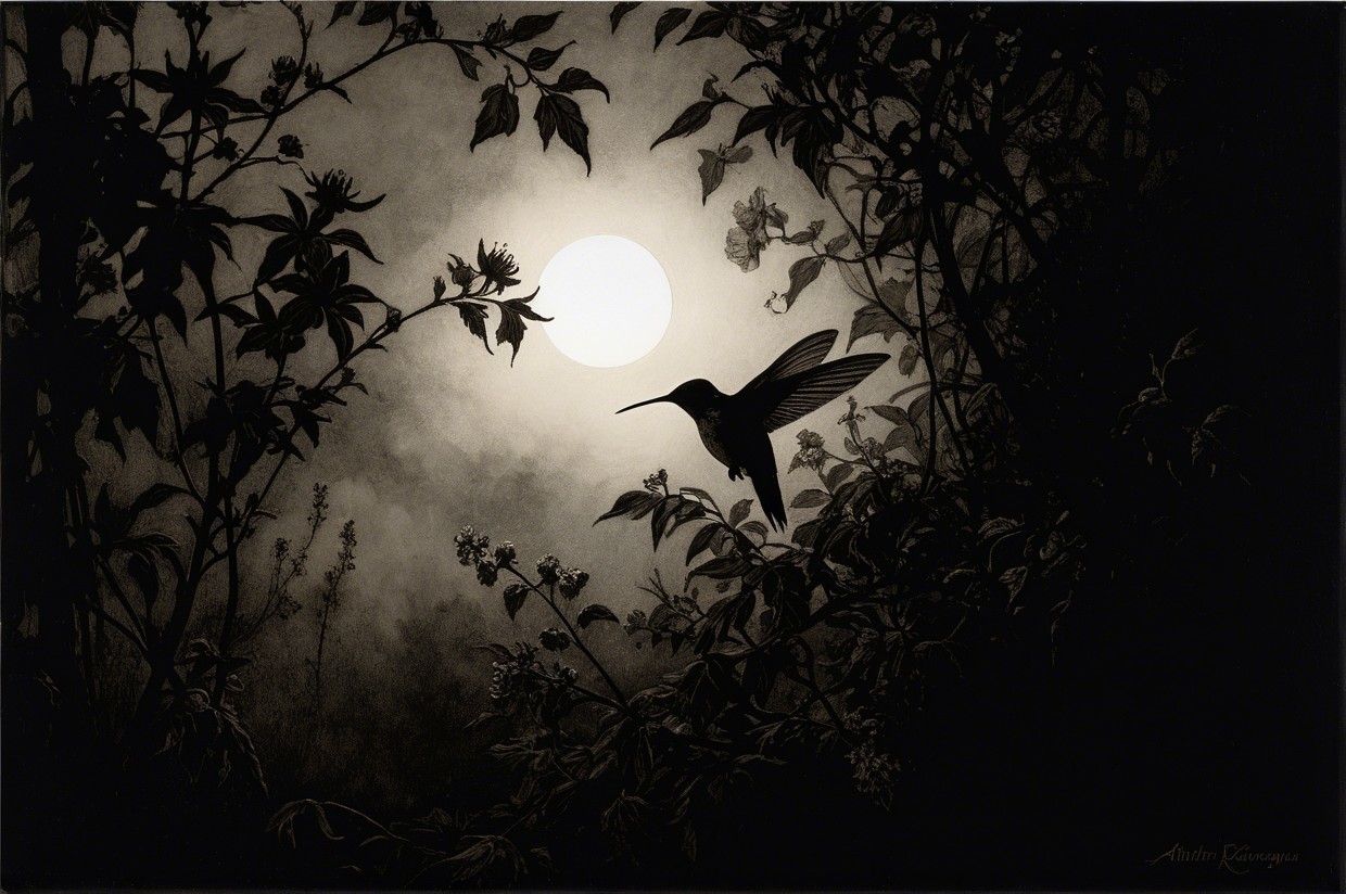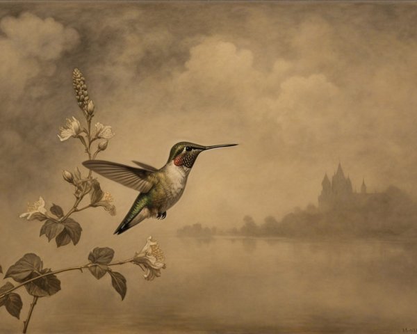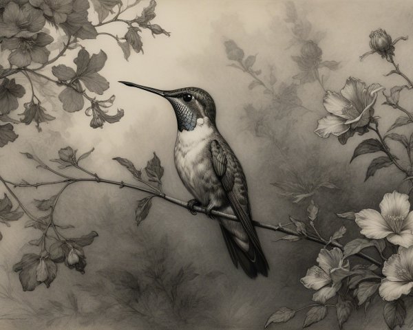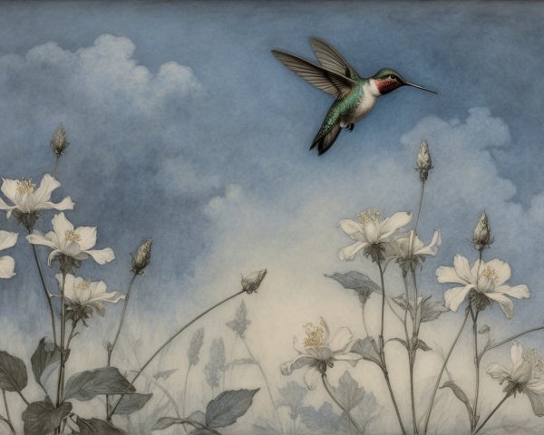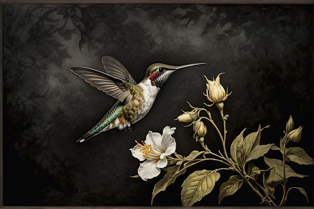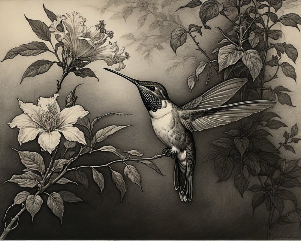 Prompt:  Deeply textured artistic charcoal etched hummingbird, Arthur Rackham, Martin Schongauer, Leonardo da Vinci, Albrecht Dürer, highly imaginative, Arthur rackham, Monet, Van Gogh, early morning mist, floral, 1100s, arthur rackham, Alexei Alexeievich Harlamov, Monet, Maxfield Parrish