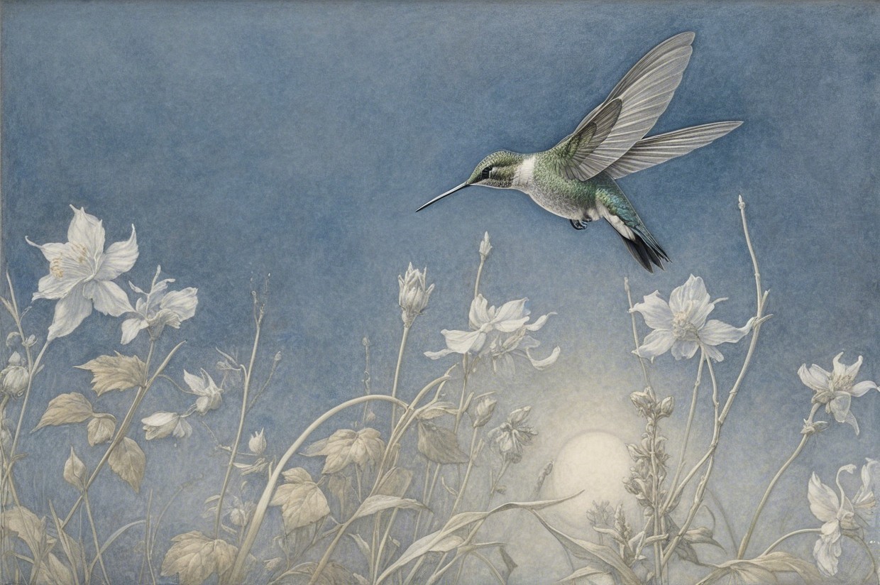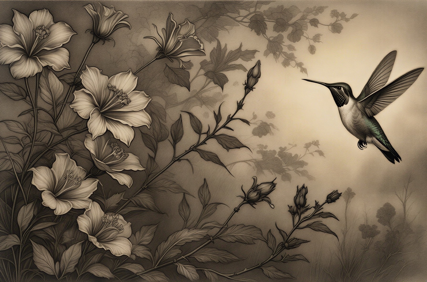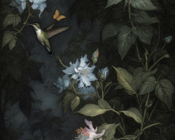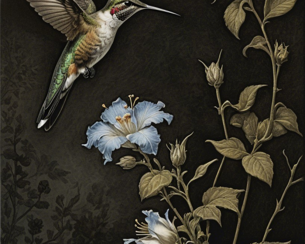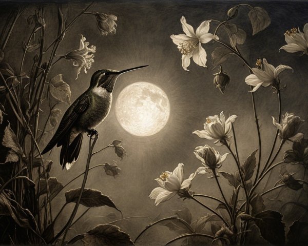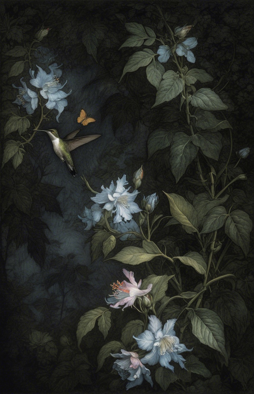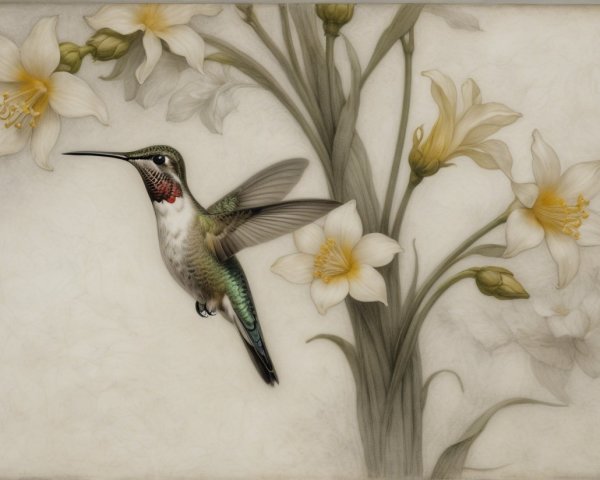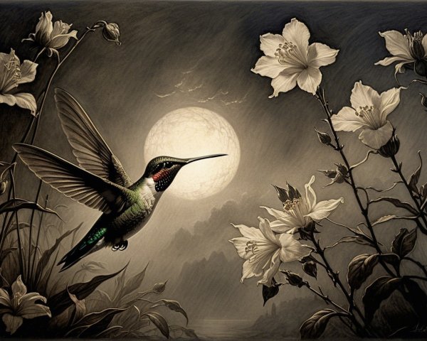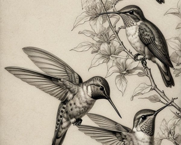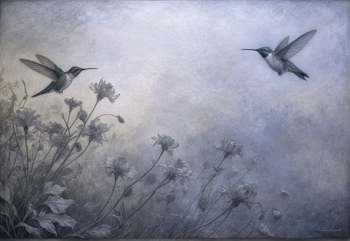 Prompt:  Deeply textured artistic charcoal etched hummingbird, Arthur Rackham, Martin Schongauer, Leonardo da Vinci, Albrecht Dürer, highly imaginative, Arthur rackham, Monet, Van Gogh, early morning mist, floral, 1100s, arthur rackham, Alexei Alexeievich Harlamov, Monet, Maxfield Parrish