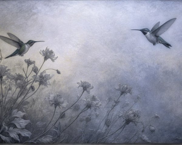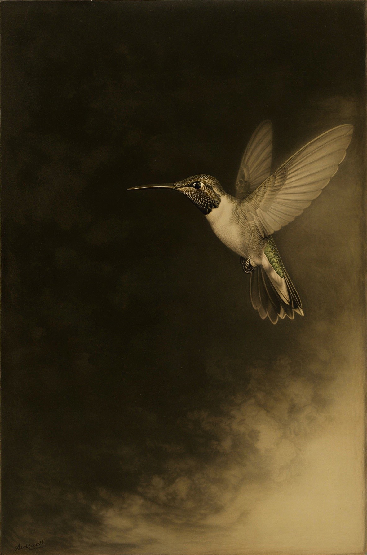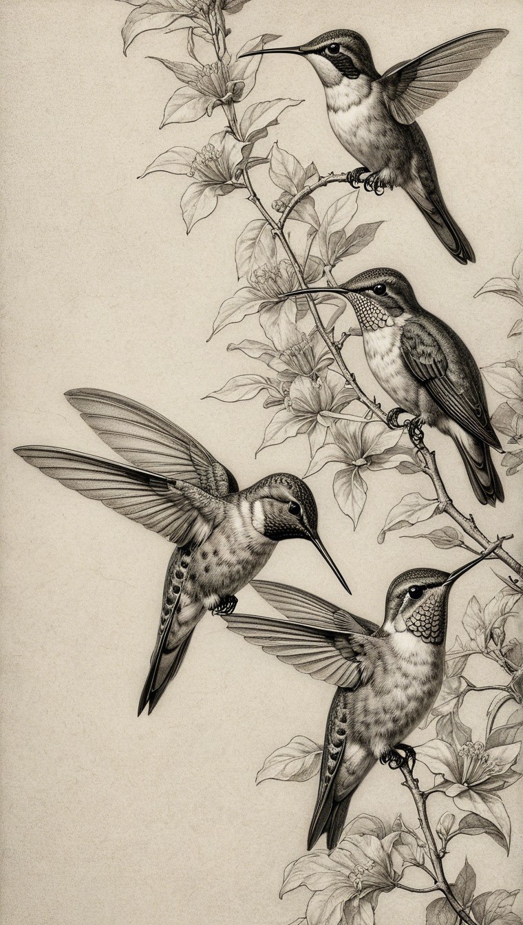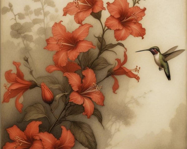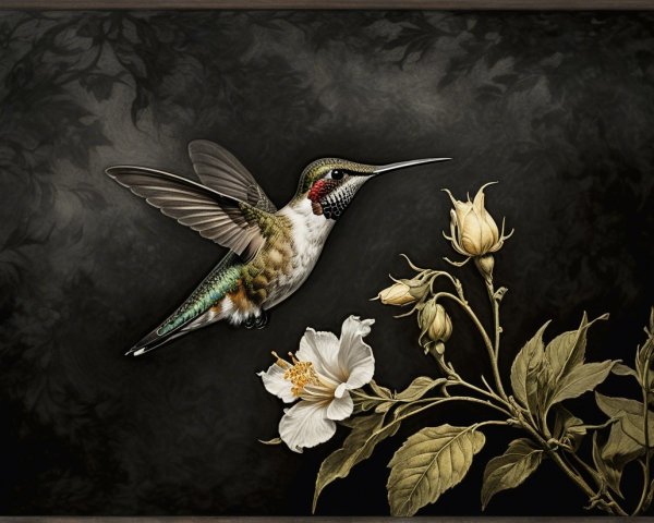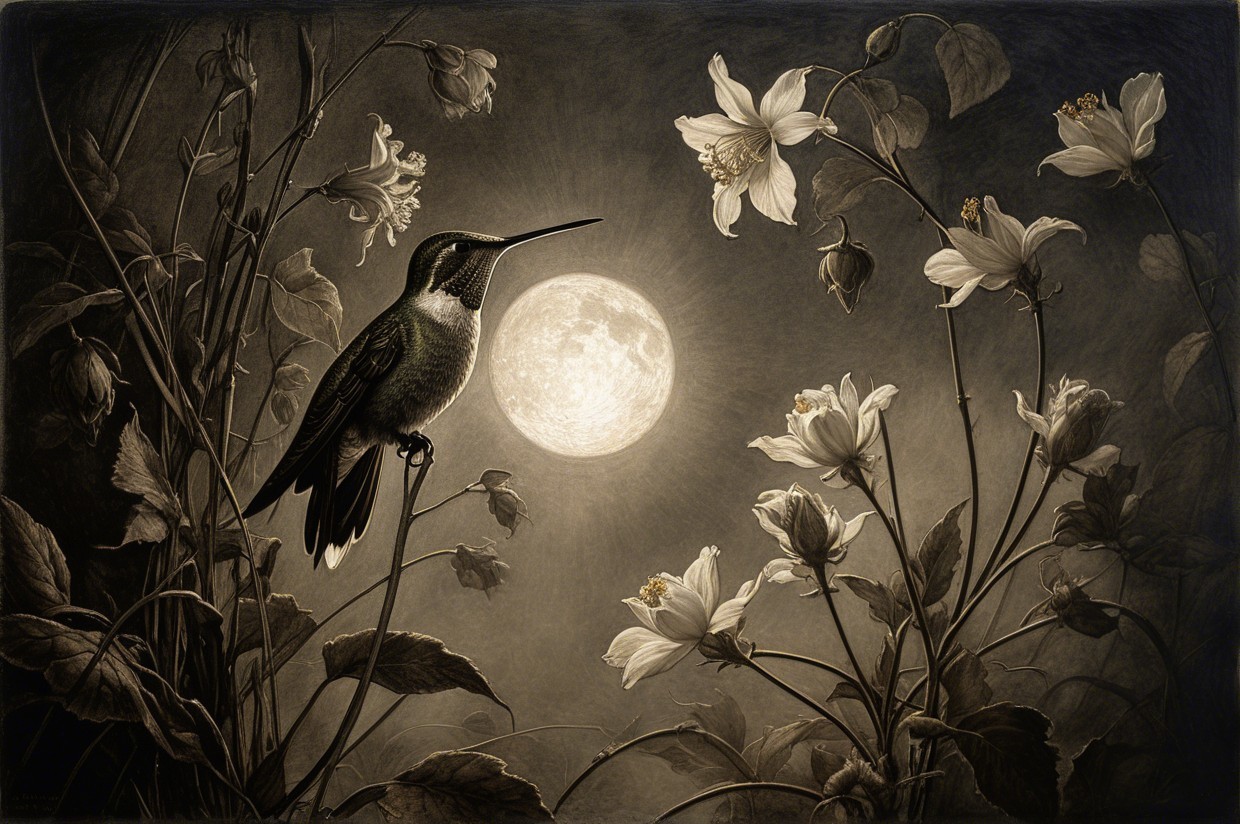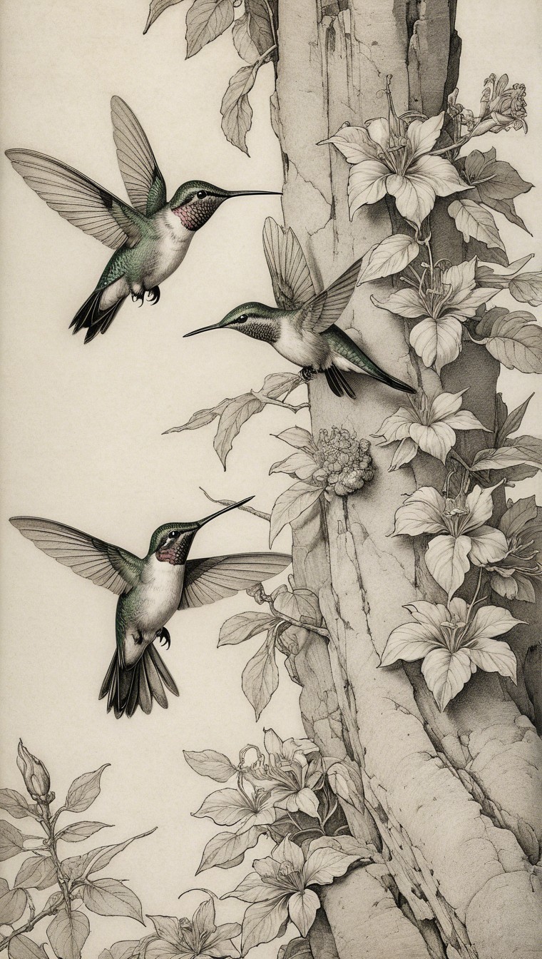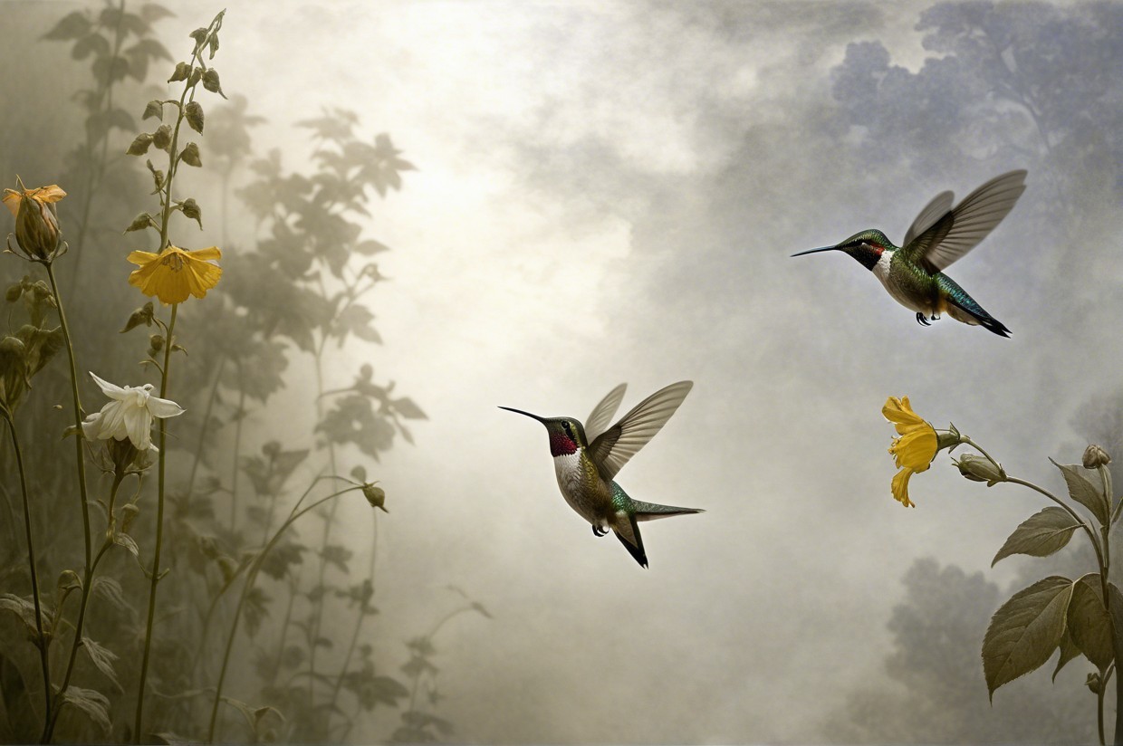 Prompt:  Deeply textured artistic charcoal etched hummingbird, Arthur Rackham, Martin Schongauer, Leonardo da Vinci, Albrecht Dürer, highly imaginative, Arthur rackham, Monet, Van Gogh, early morning mist, floral, 1100s, arthur rackham, Alexei Alexeievich Harlamov, Monet, Maxfield Parrish