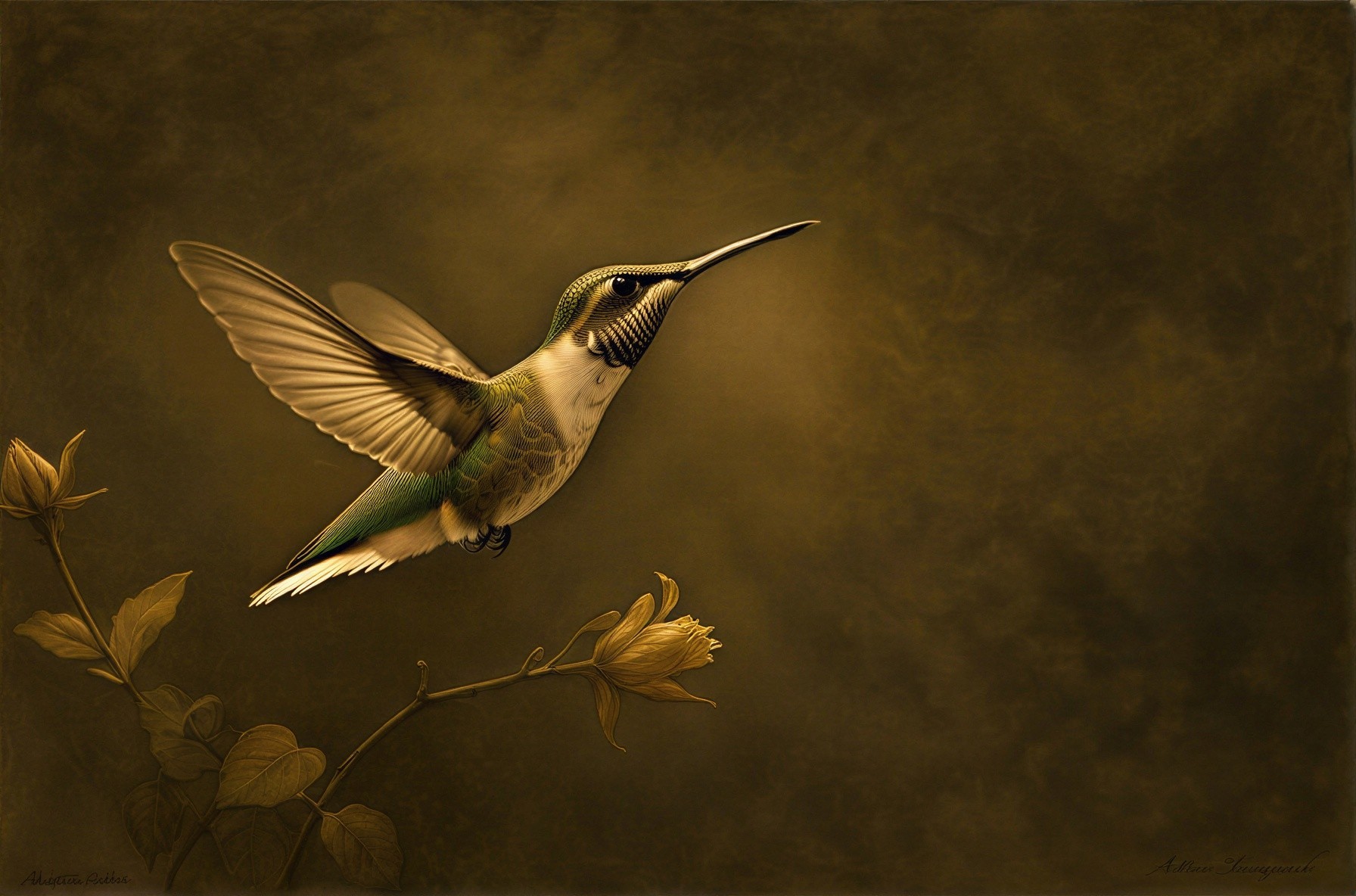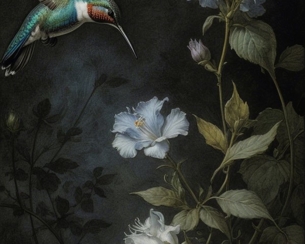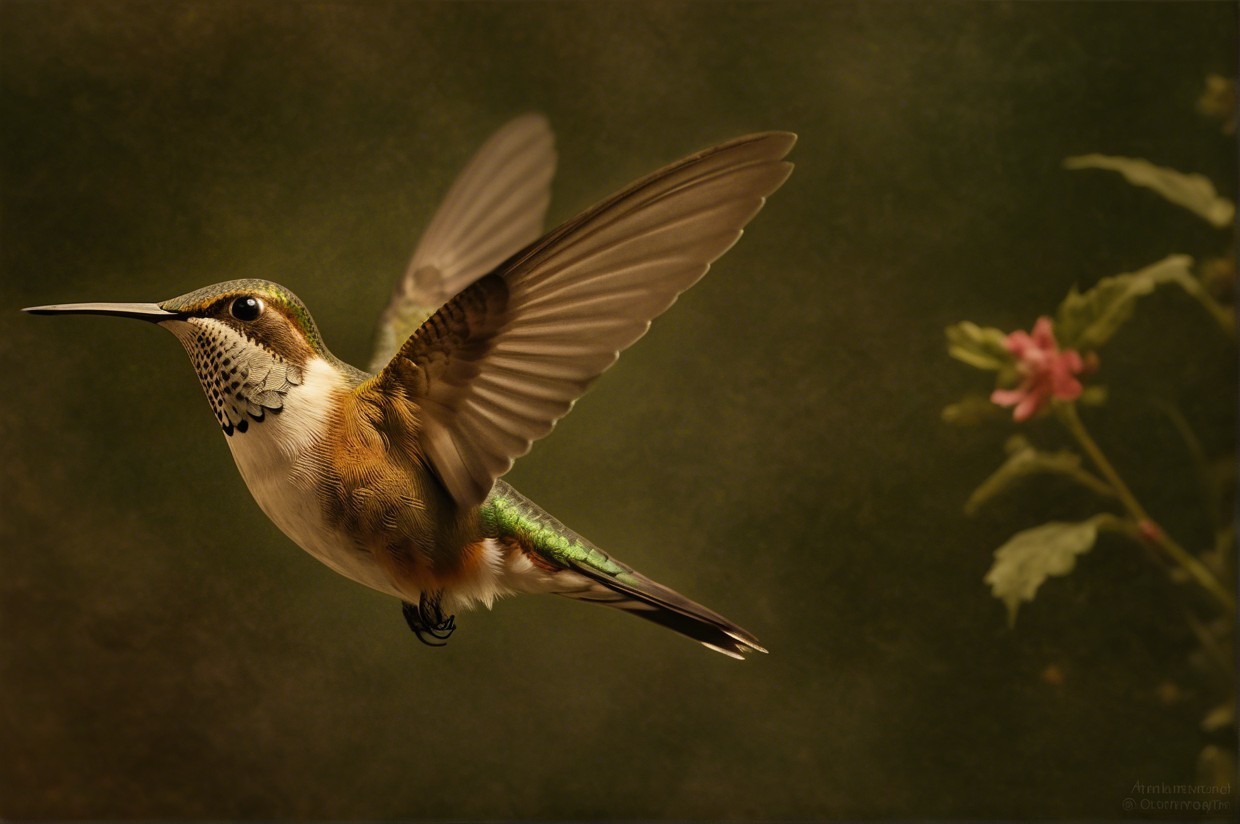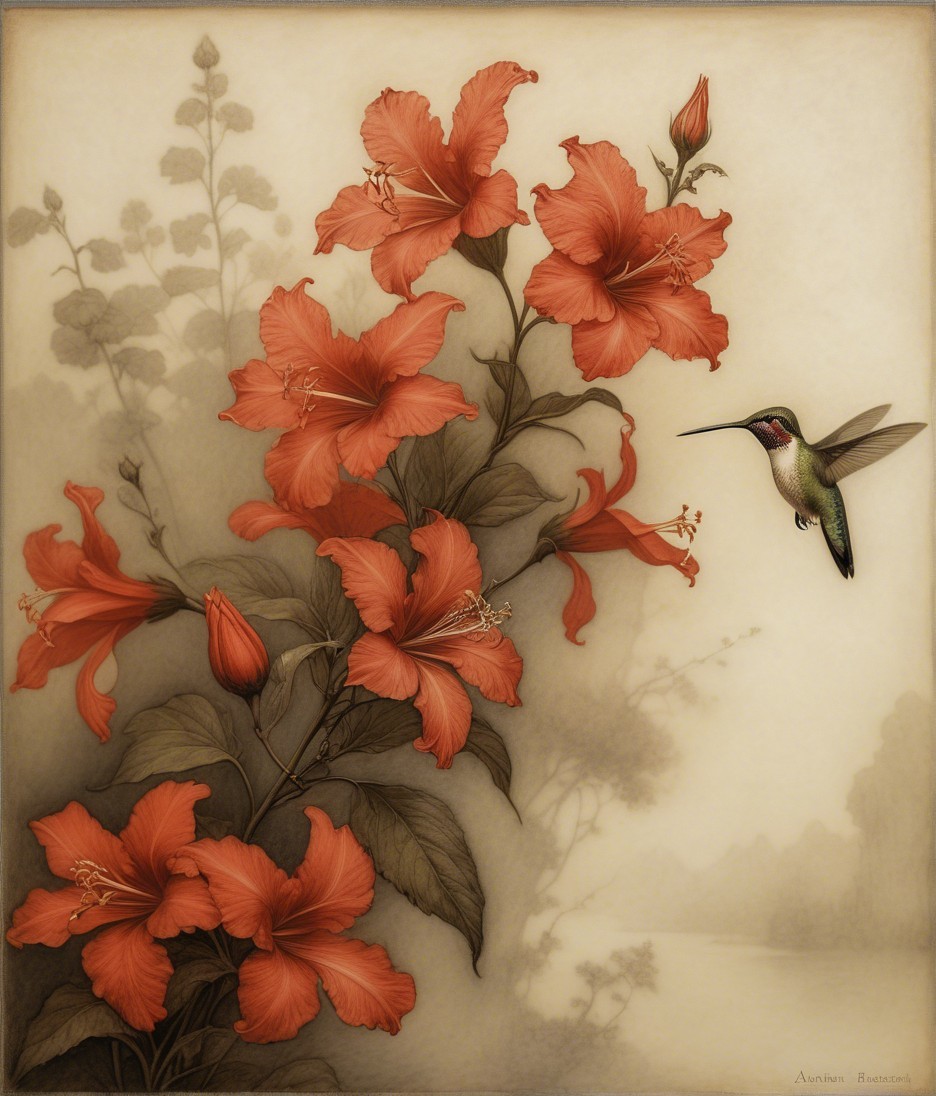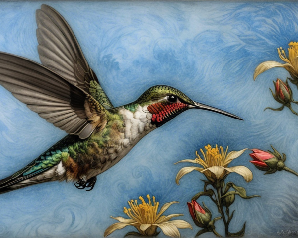 • Prompt: Deeply textured artistic charcoal etched hummingbird, Arthur Rackham, Martin Schongauer, Leonardo da Vinci, Albrecht Dürer, highly imaginative, Arthur rackham, Monet, Van Gogh, early morning mist, floral, 1100s, arthur rackham, Alexei Alexeievich Harlamov, Monet, Maxfield Parrish