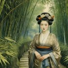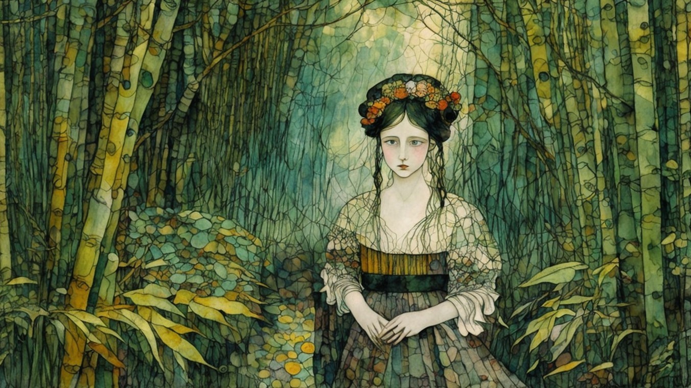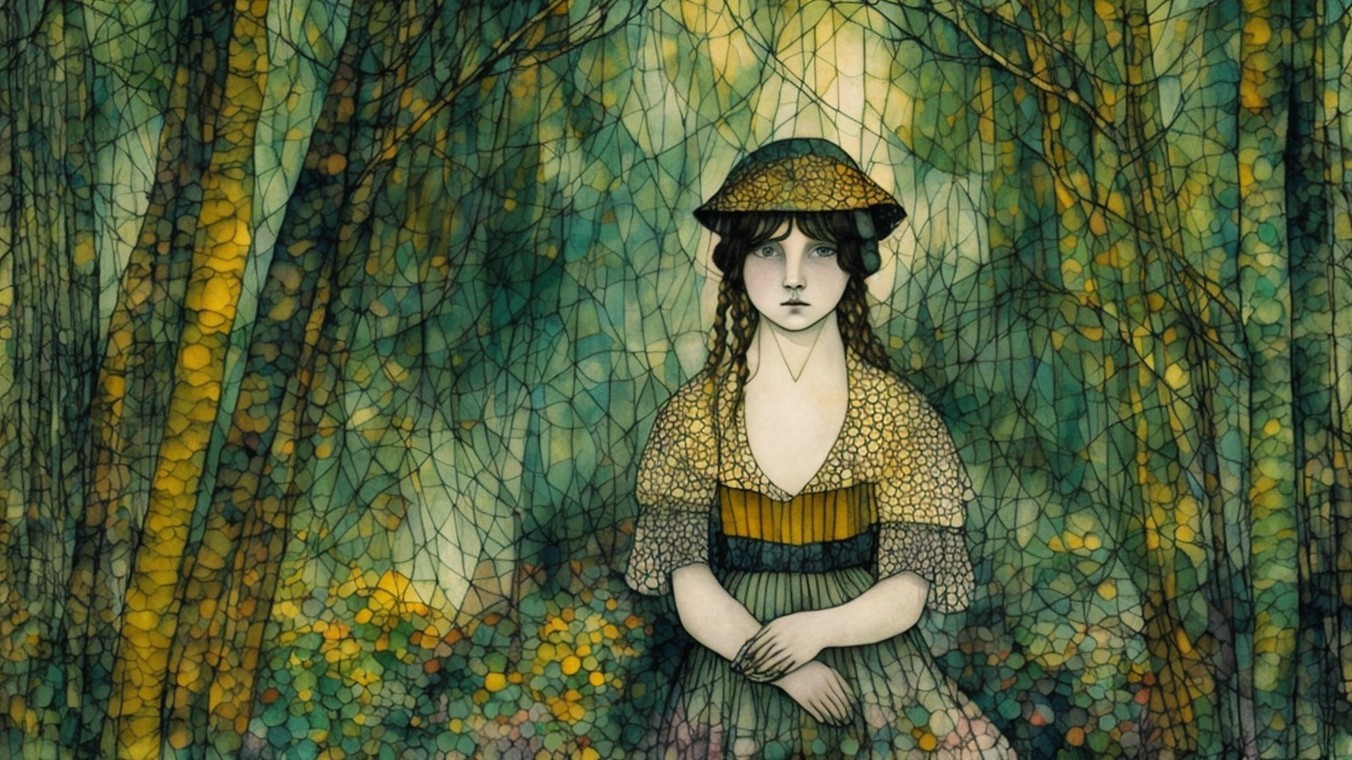 A stylized illustration of a young woman in a forest, featuring muted colors and geometric shapes. She has a serene expression, dressed in a yellow and gray outfit, surrounded by trees and plants.