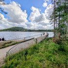 Make a Nice postcards Sith a smalle river in a little village with little houses in woord and a Britse over thé river and with flitsers in thé garden Gedore thé houses