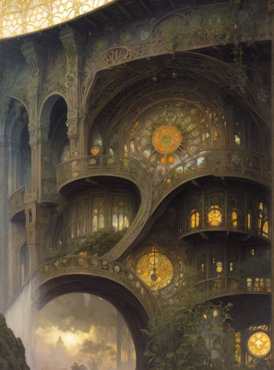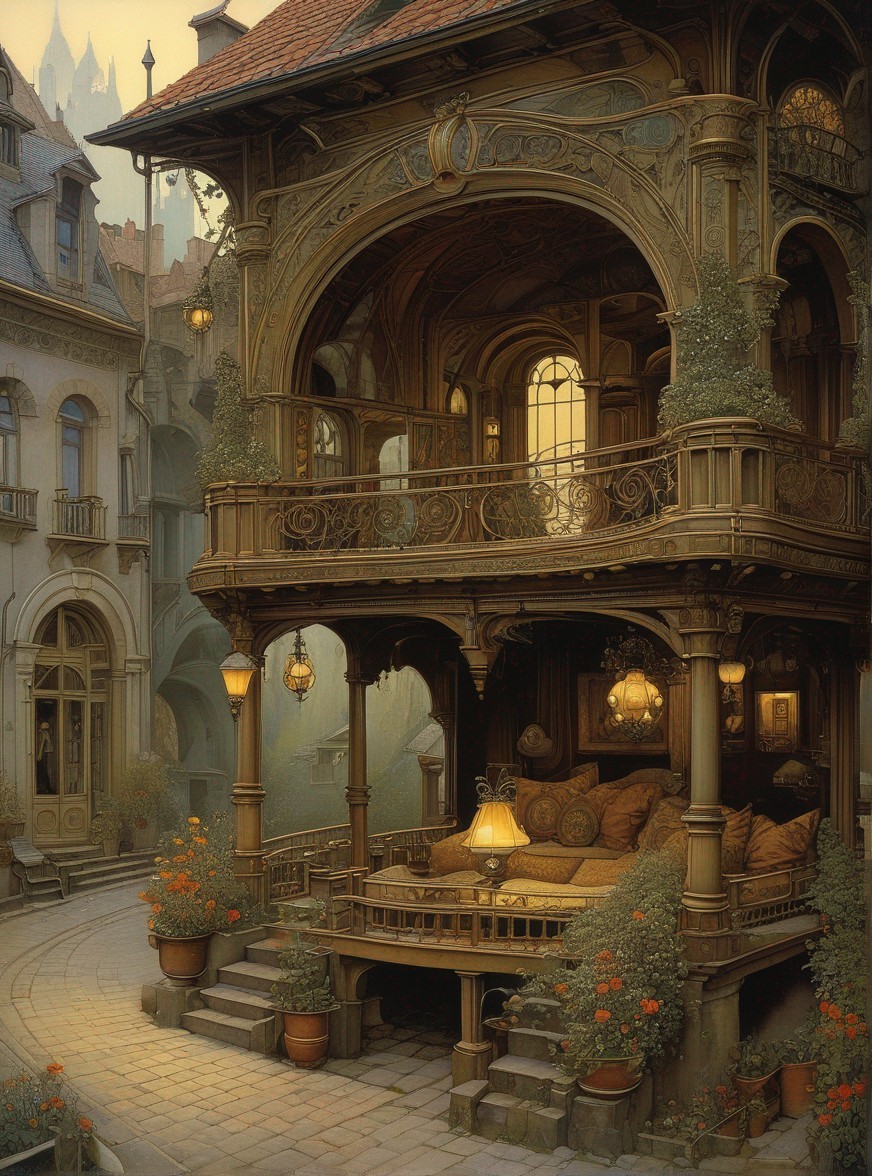 A painting of a woman reclining in a boat with ornate architecture and autumn foliage in the background, evoking a fantasy atmosphere.