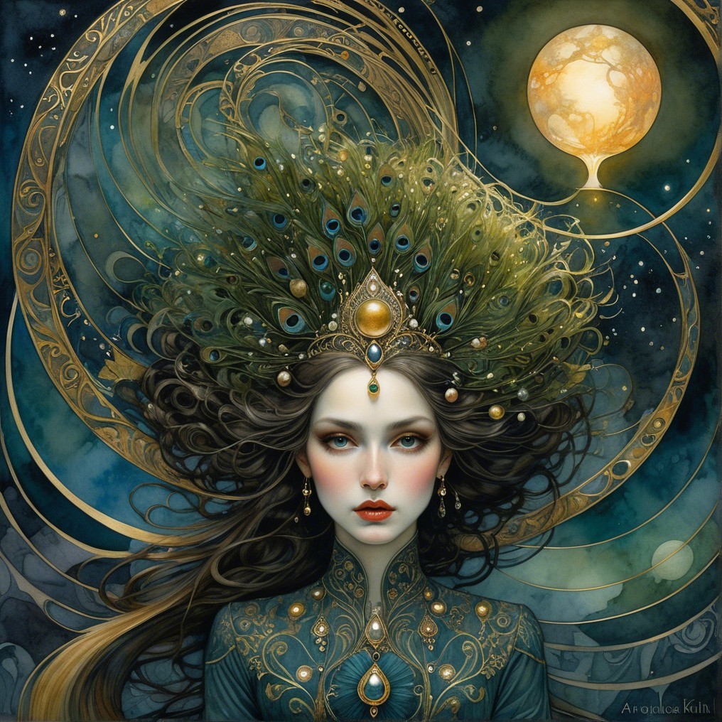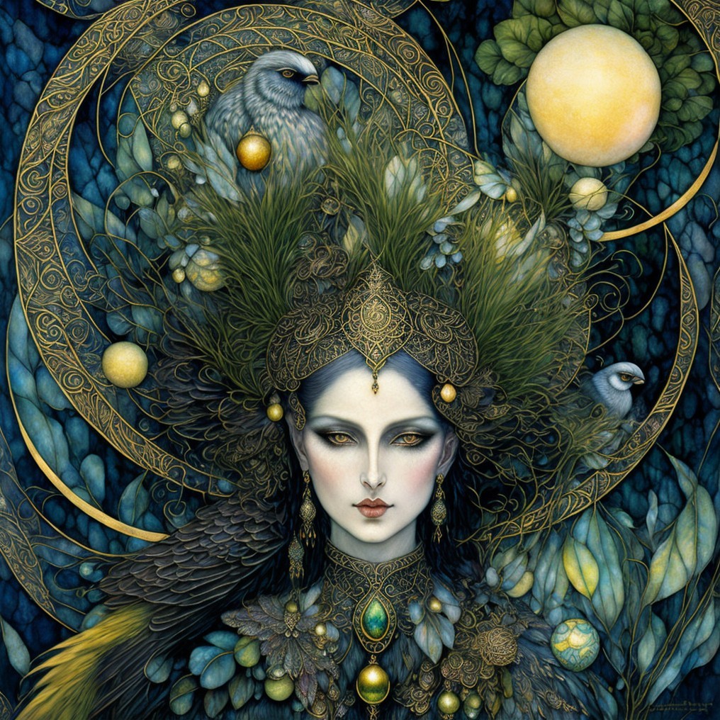 A regal woman adorned with a crown of intricate patterns and surrounded by vibrant birds. The scene features a mystical moon, blending nature and elegance in a captivating design.