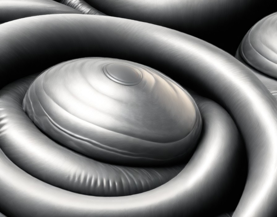 An abstract digital art piece featuring swirling metallic shapes in shades of grey and brown, centered around a bright orange orb.
