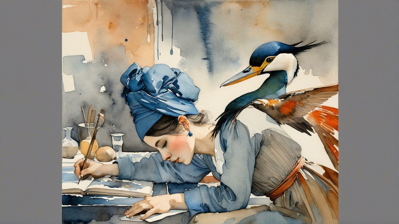 A serene watercolor illustration depicts a young woman sleeping peacefully on a bed, surrounded by soft pillows. The room has a calm atmosphere, with light colors and a hint of nostalgia.