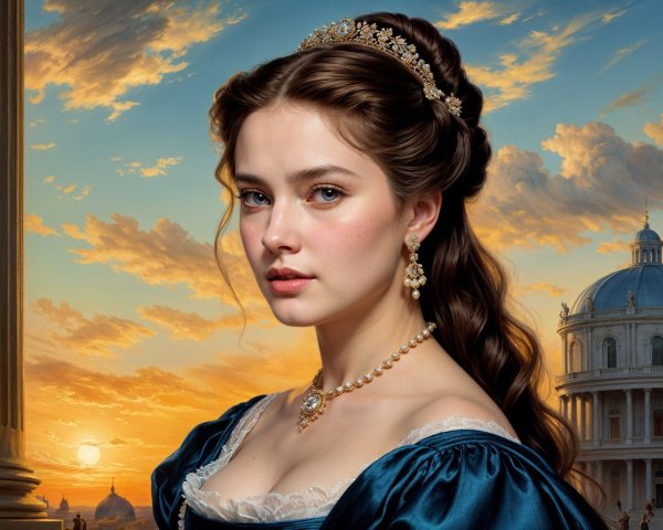 A portrait of a woman with an ornate, jeweled headdress, large golden earrings, and an intense gaze against a muted background.