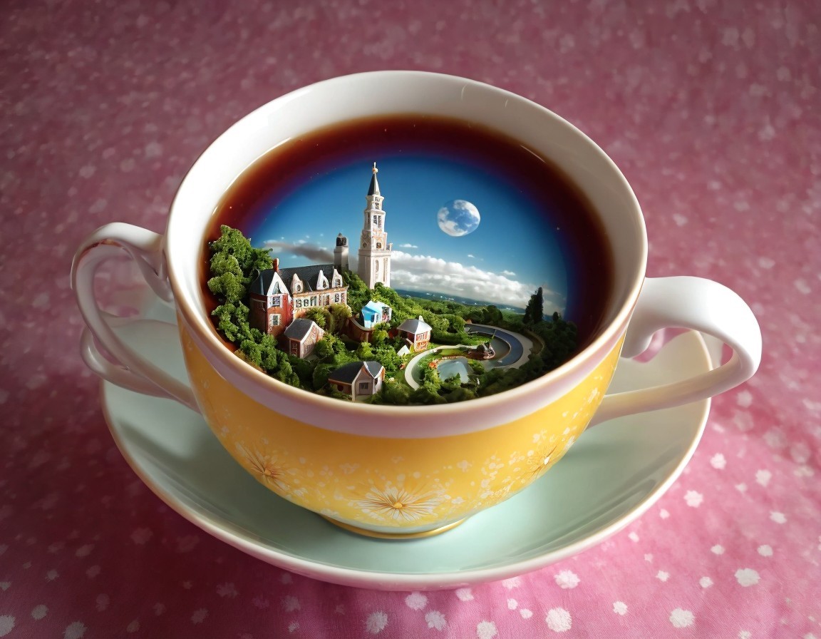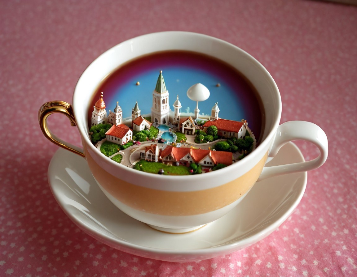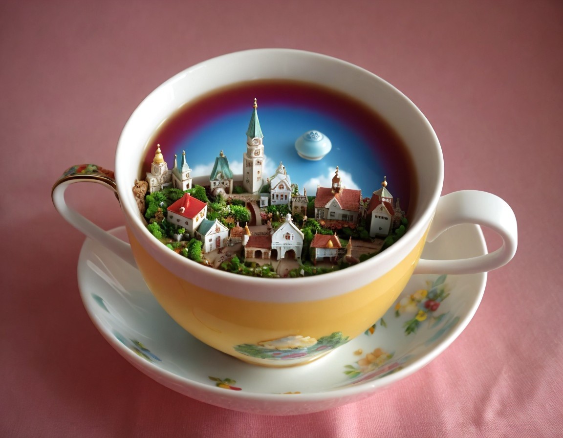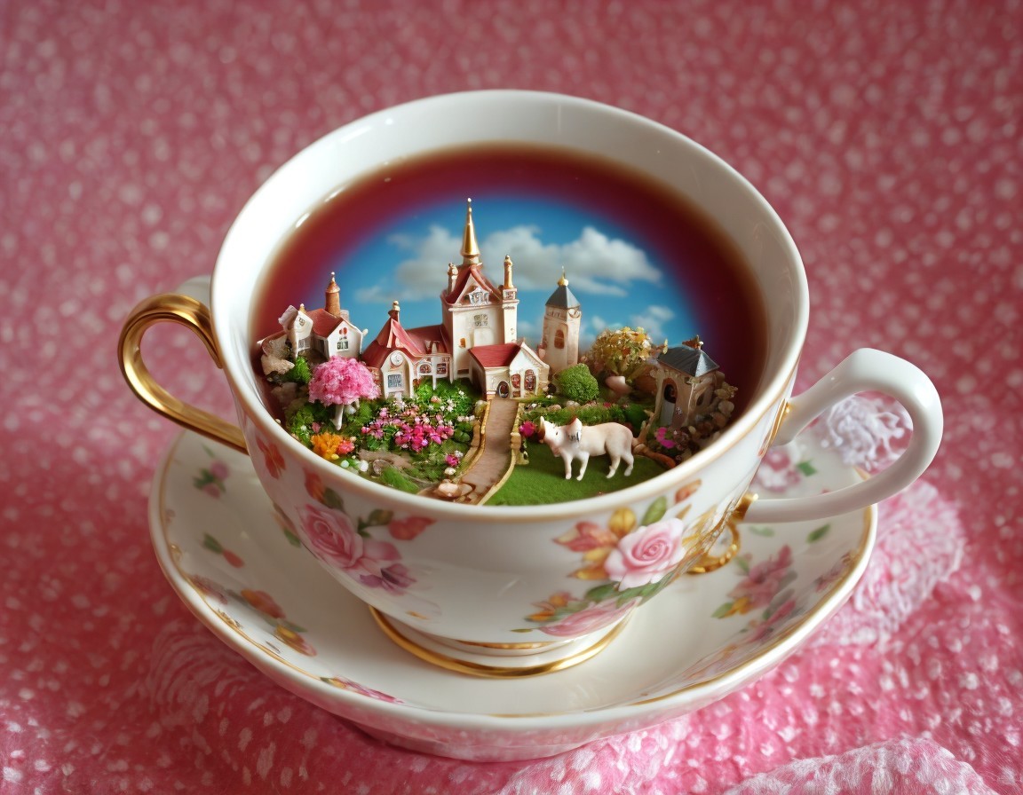 A whimsical scene inside a teacup features a charming miniature village with colorful houses, lush gardens, and a small cup, all set against a serene blue sky and fluffy clouds.