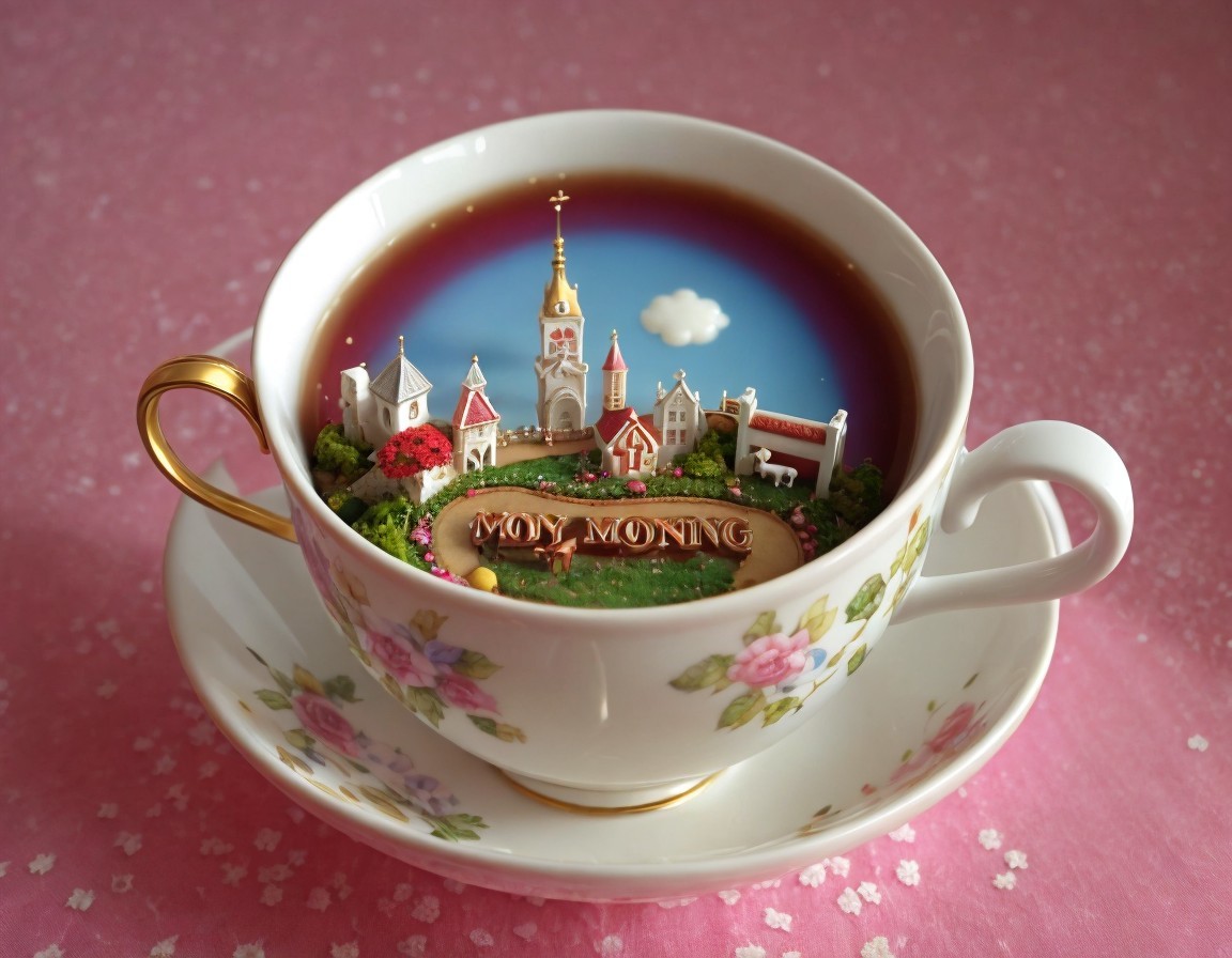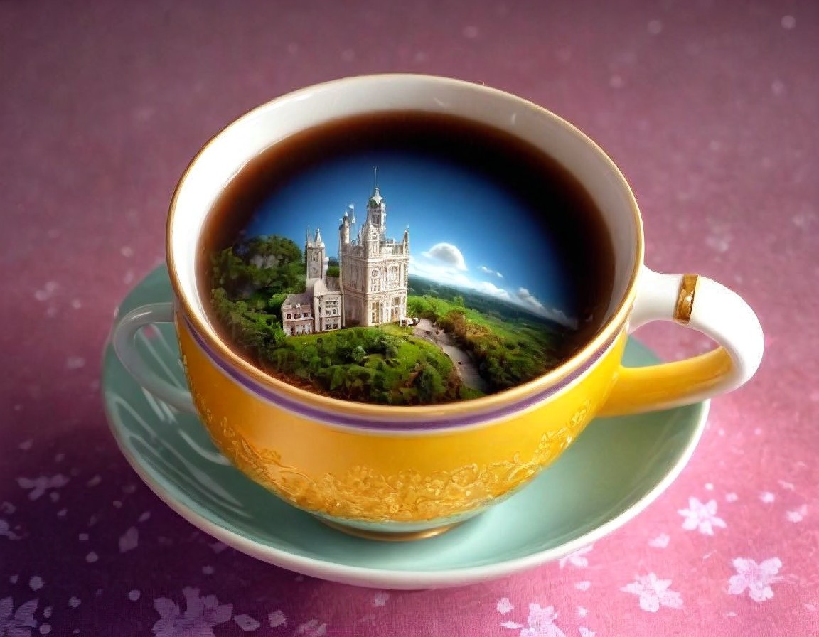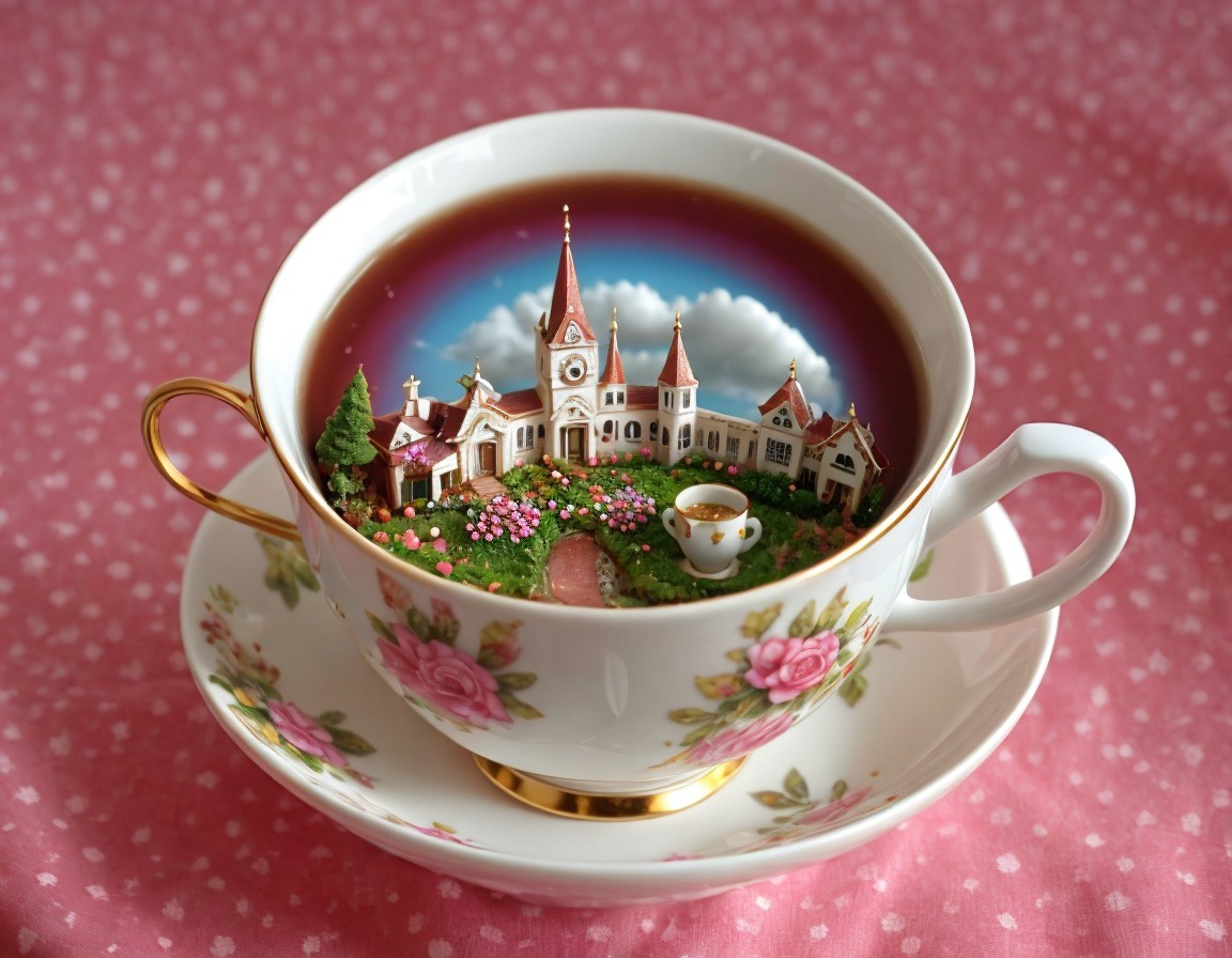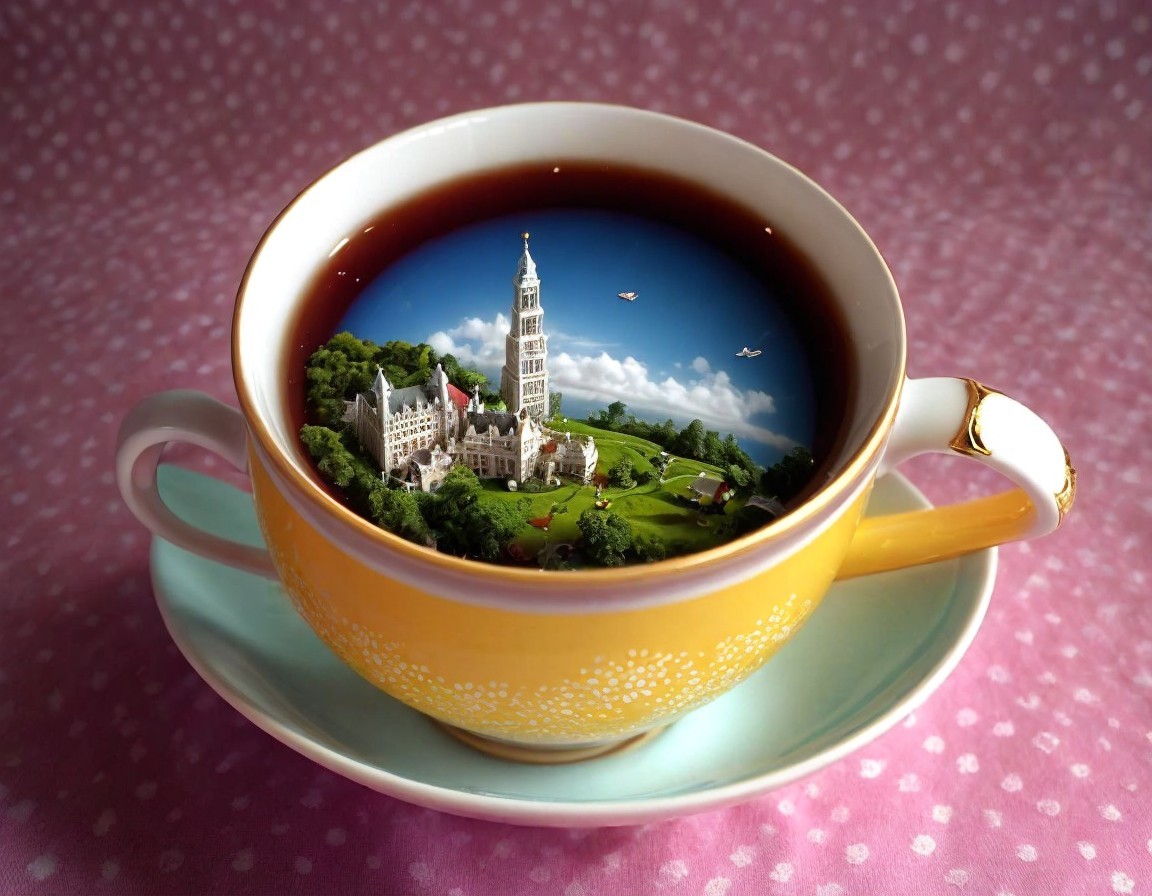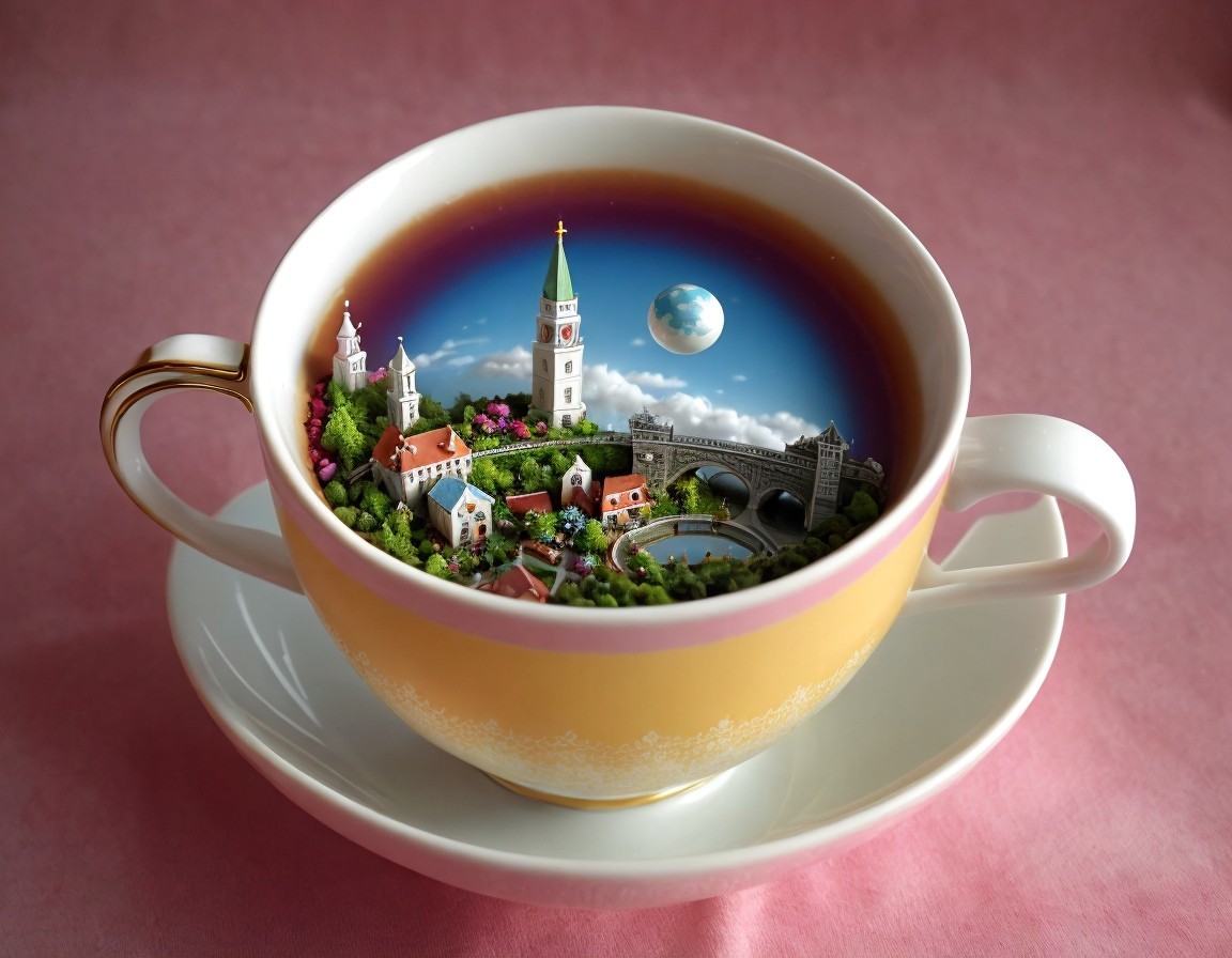 A whimsical scene inside a teacup features a charming miniature village with colorful houses, lush gardens, and a small cup, all set against a serene blue sky and fluffy clouds.