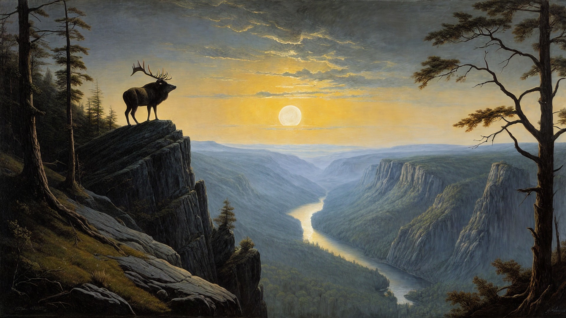 A majestic stag stands atop a rocky ledge, overlooking a serene river winding through lush mountains under a glowing sunset. The scene captures nature's beauty and tranquility.