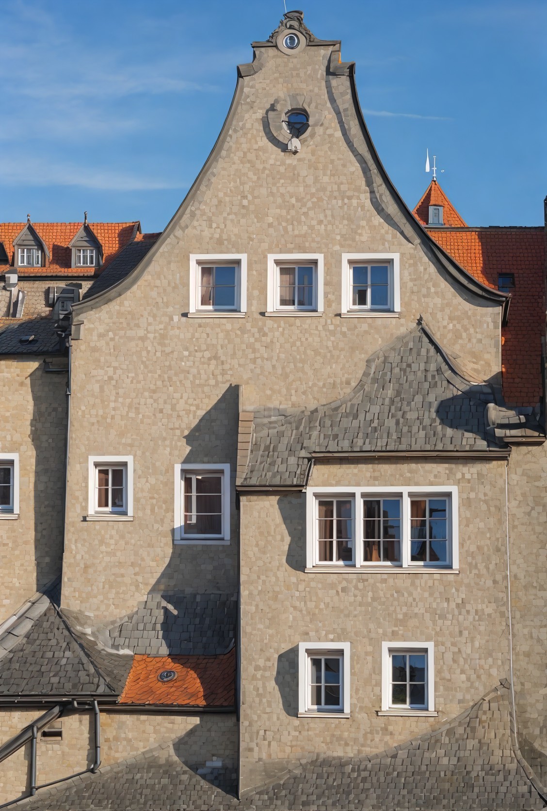 A unique gabled building with a textured facade, multiple windows, and a clear blue sky behind it.