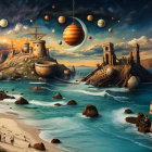 A surreal landscape featuring rocky islands, ancient towers, and a vibrant sea. Planetary bodies orbit above, creating a whimsical blend of nature and fantasy, with a dramatic sky at sunset.