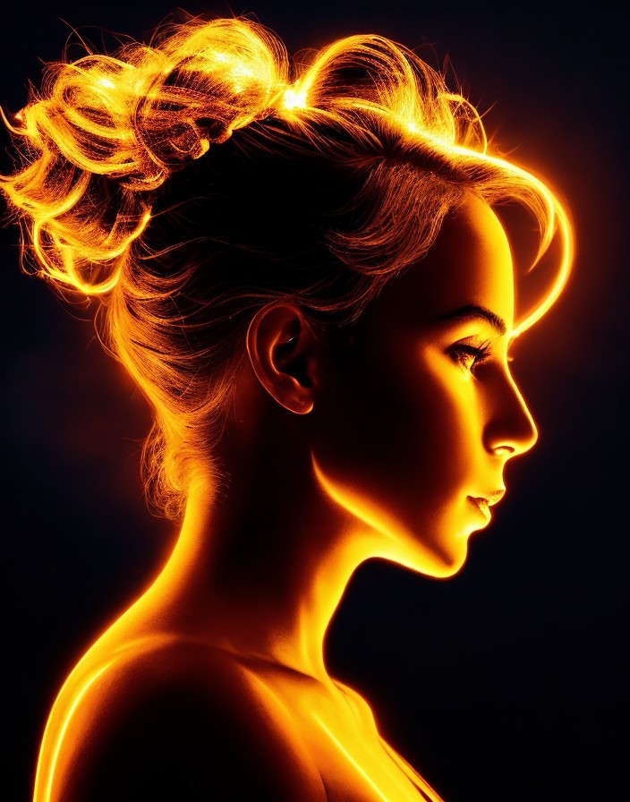 A digital artwork of a woman in profile with her hair aglow like embers against a dark background, conveying a fiery, mystical aura.