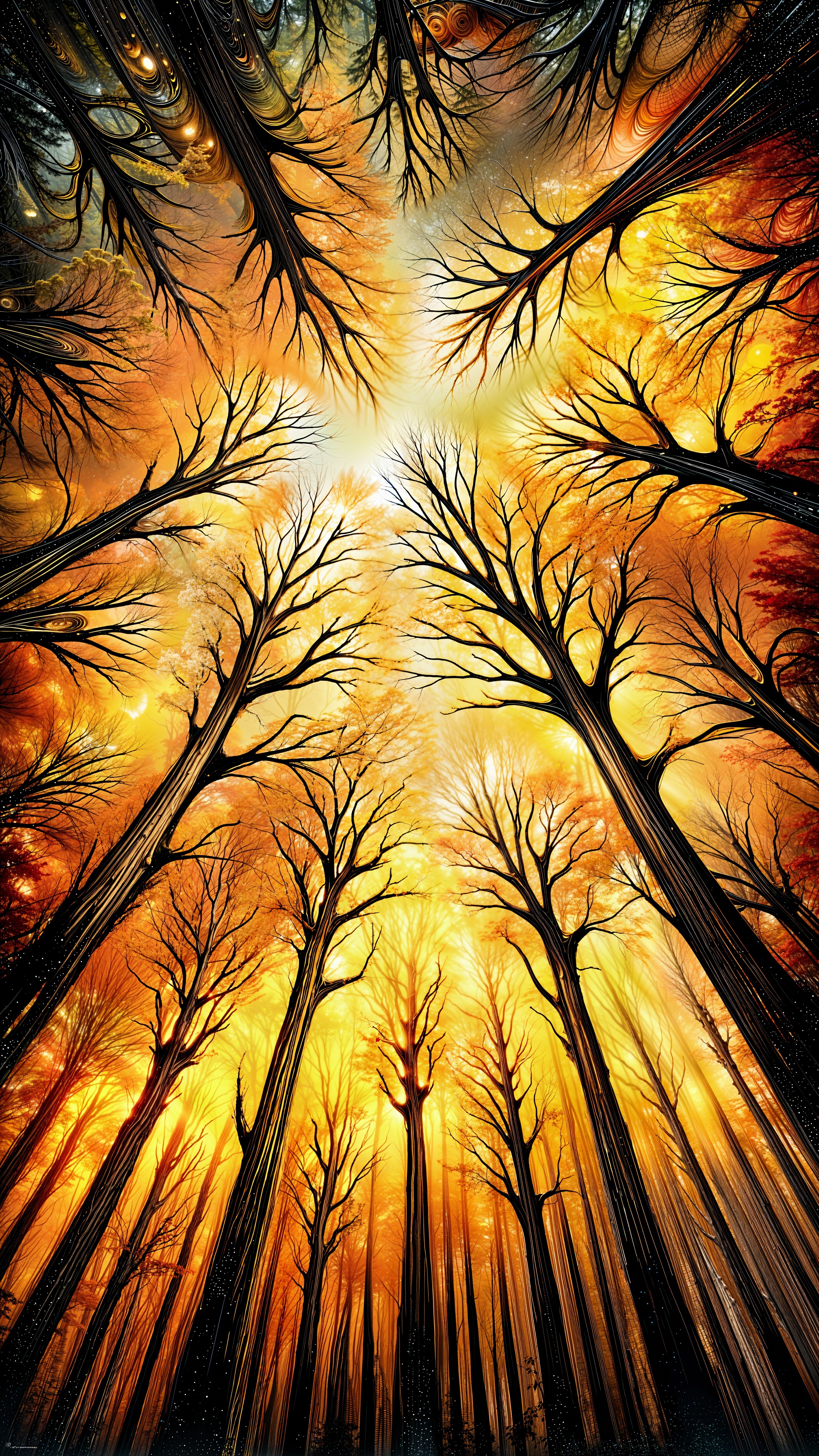 A surreal landscape featuring dark, leafless trees with glowing, intricate roots. The background transitions from deep blues to vibrant oranges and yellows, resembling a cosmic environment. forest of neural networks. 12. 2024.