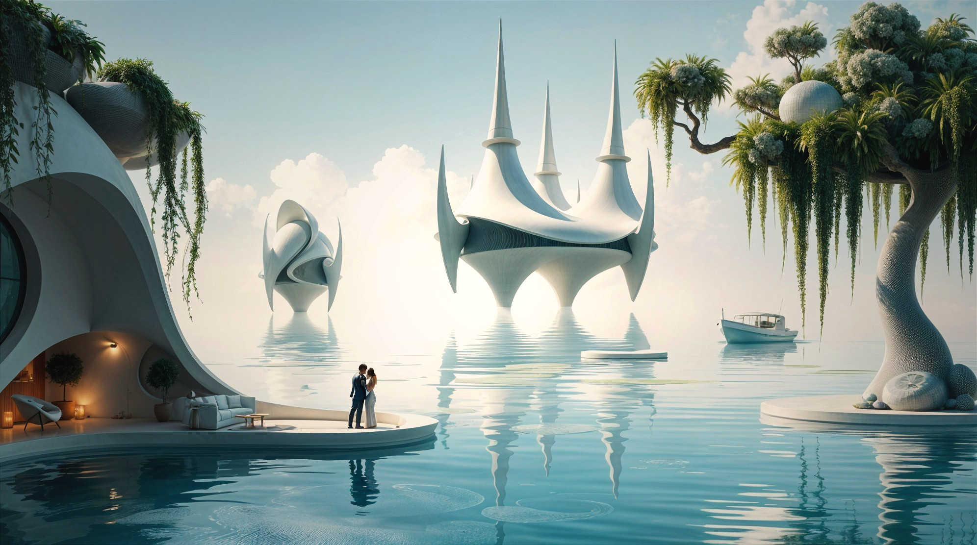 A serene futuristic landscape features sleek, surreal architecture rising from tranquil waters. A couple embraces on a platform, surrounded by lush greenery and a gentle boat in the distance.