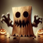 A playful Halloween scene featuring a monster made from a brown paper bag, with jagged eyes and teeth. It has furry hands and is surrounded by carved pumpkins, adding a festive vibe.