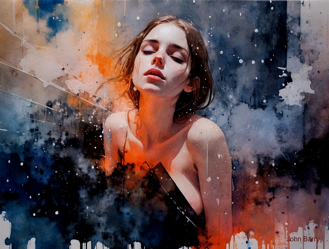 A striking watercolor painting features a woman with flowing hair, her expression serene yet intense, surrounded by a vibrant blend of blues, oranges, and black, creating a dreamlike atmosphere.
