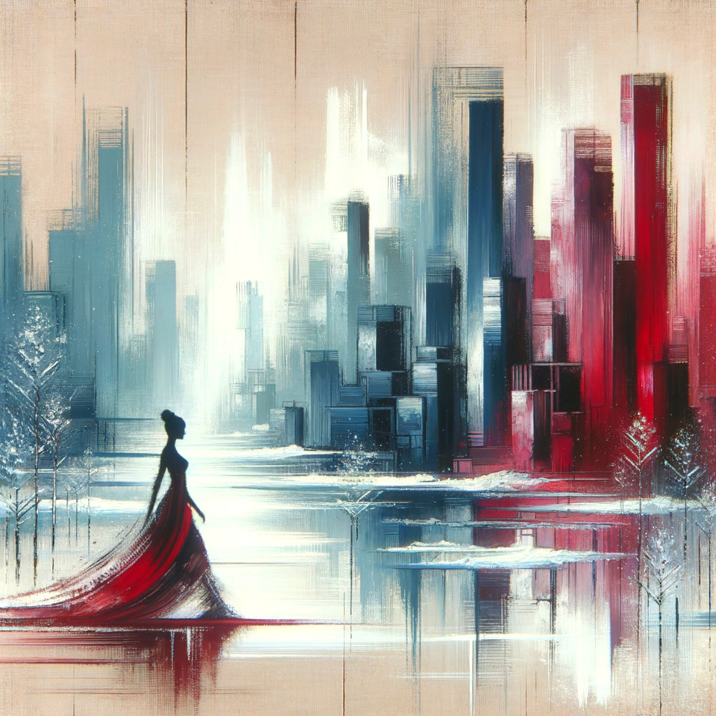 A graceful figure in a flowing red dress walks along a shimmering water's edge, surrounded by abstract city skyscrapers in shades of blue and red, creating a striking urban landscape.